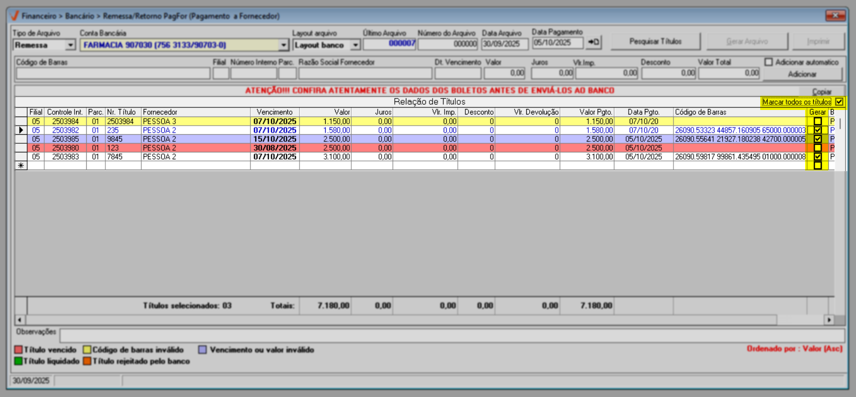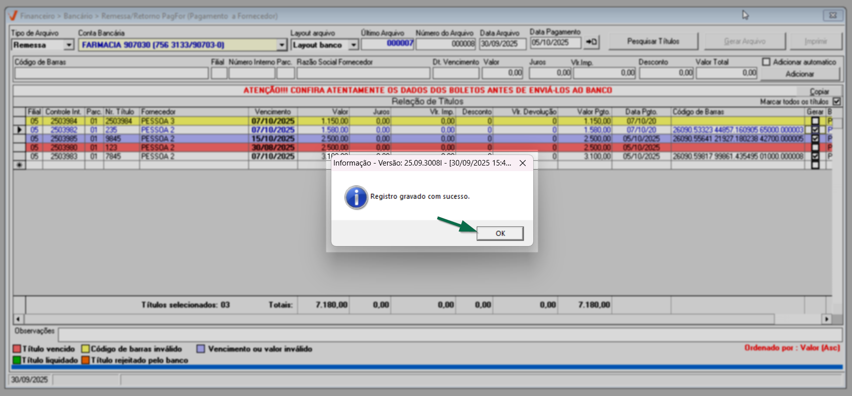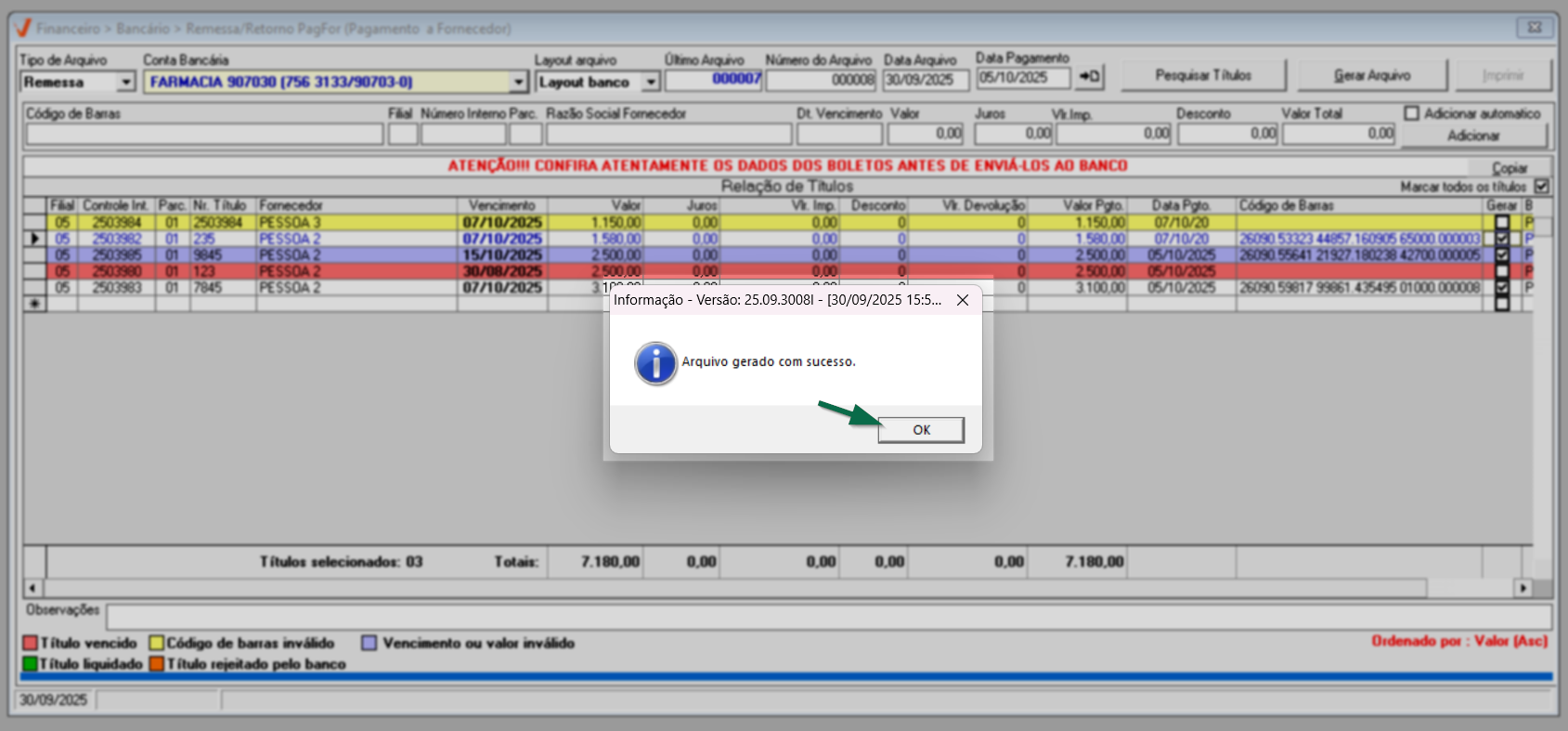 Vale ressaltar que apenas os documentos que possuem código de barras válidos, poderão compor a remessa que será gerada para o banco.