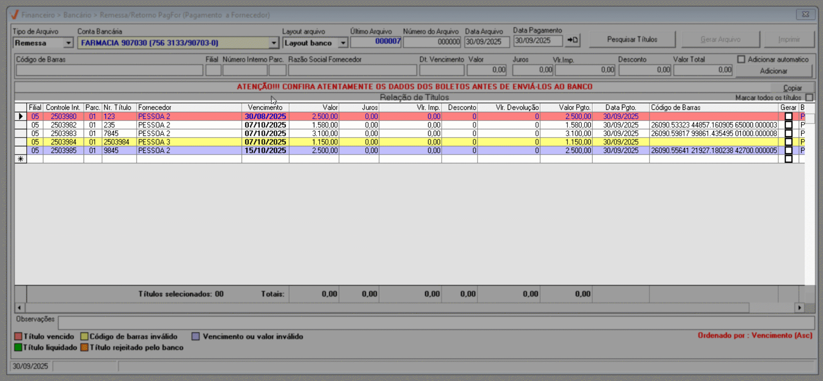 - Roxo: Indica que o vencimento ou o valor do documento não coincide com o código de barras do título. Para este cenário é indicado verificar o lançamento e efetuar as devidas correções.