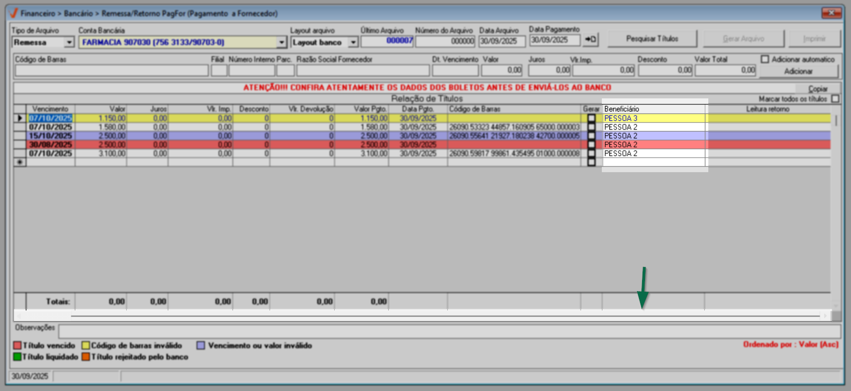 A correta informação do beneficiário é necessária para a utilização dos recursos PagFor (Pagamento a Fornecedor) e Conciliação por DDA (Débito Direto Autorizado), pois, os títulos são enviados e retornados para o banco, em nome do beneficiário que os emitiu e não do fornecedor da nota fiscal.
