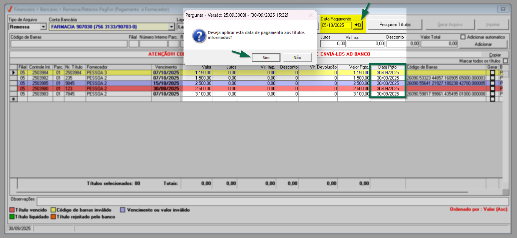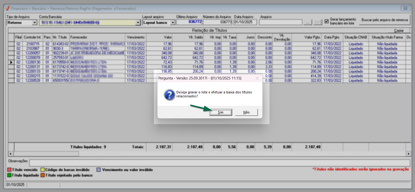 Para efetuar a baixa dos títulos, tecle o atalho F2, a seguir será apresentada uma mensagem solicitando a confirmação da operação, basta confirmar.