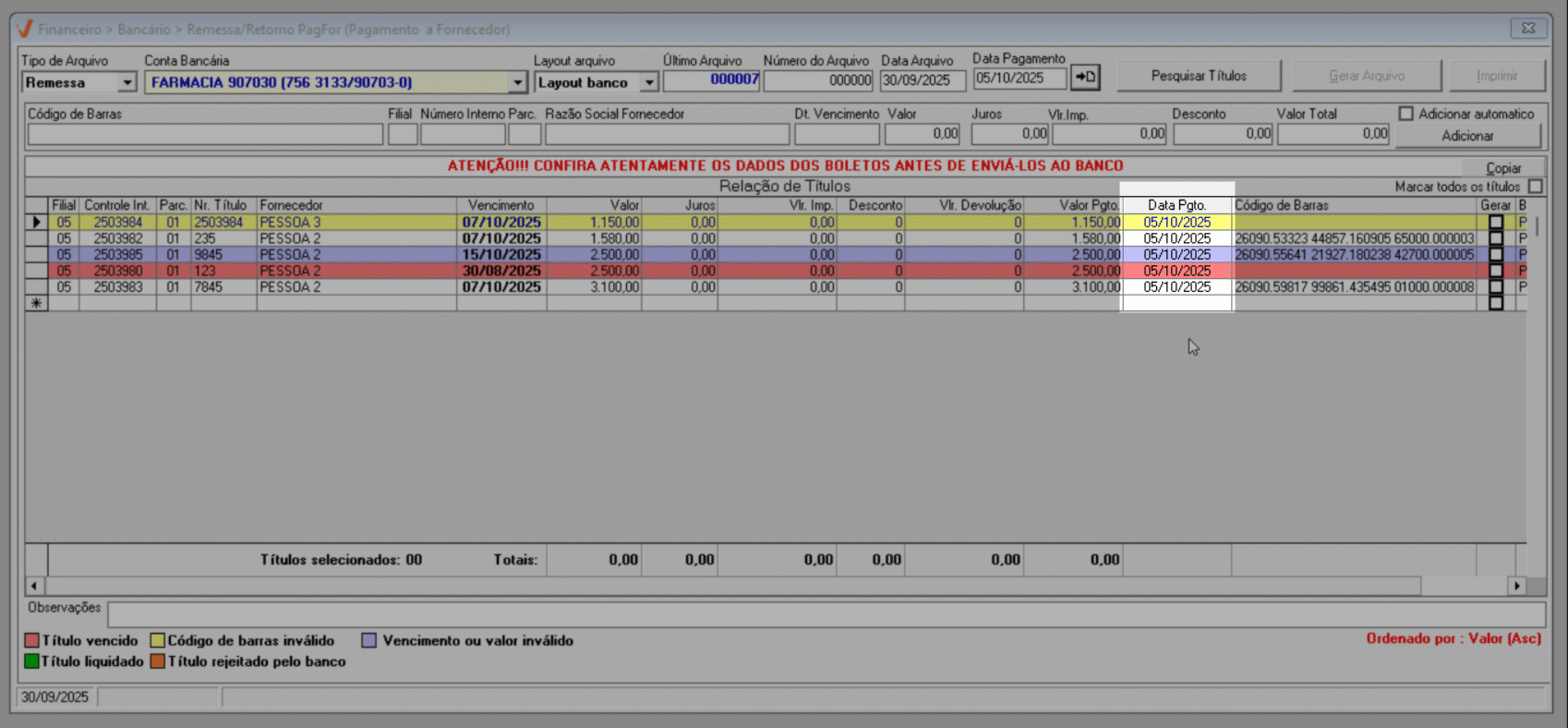 Após a aceitação dos títulos no sistema do banco, o usuário terá que realizar a autorização do pagamento através do próprio programa do banco (site, aplicativos ou programas). Cabe ao responsável por este processo efetuá-lo. Caso contrário os pagamentos não serão realizados.