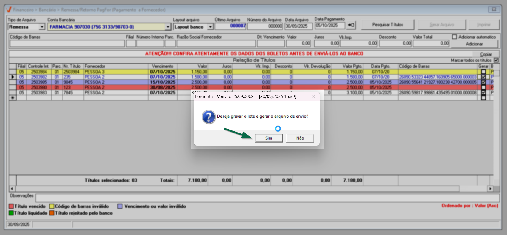 A seguir, para salvar e gerar a remessa, tecle o atalho F2. Em seguida, será apresentada a mensagem: “Deseja alterar o lote e gerar o arquivo de envio?”, clique em "Sim" para confirmar.
