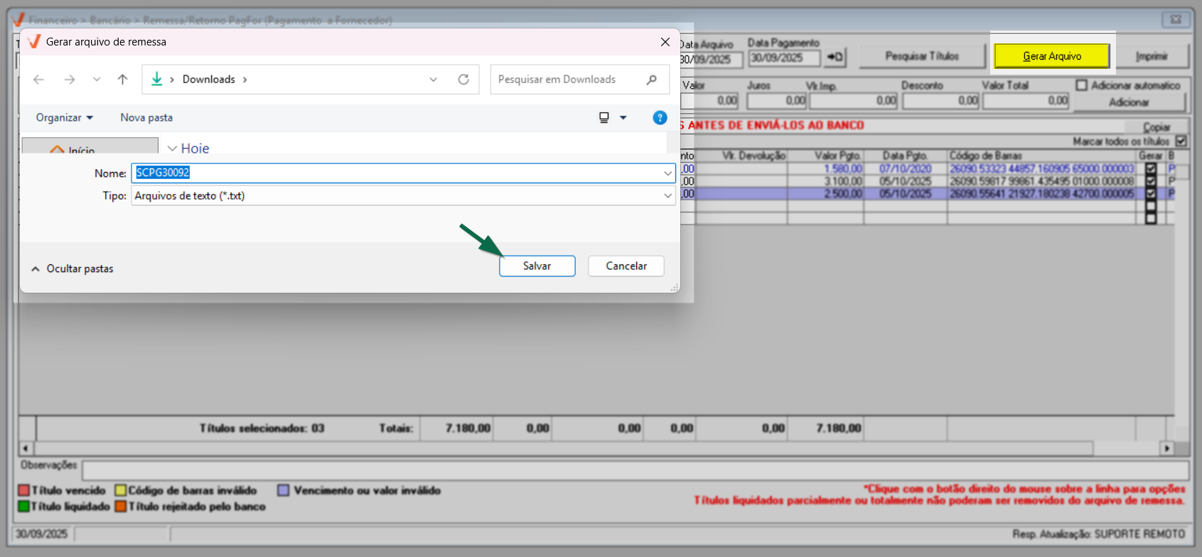 - Gerar arquivo de remessa: Para gerar o arquivo, clique no botão >> "Gerar arquivo", que estará habilitado na seção acima, como demonstrado na imagem a seguir. Em seguida, escolha o local onde o arquivo será salvo e confirme.