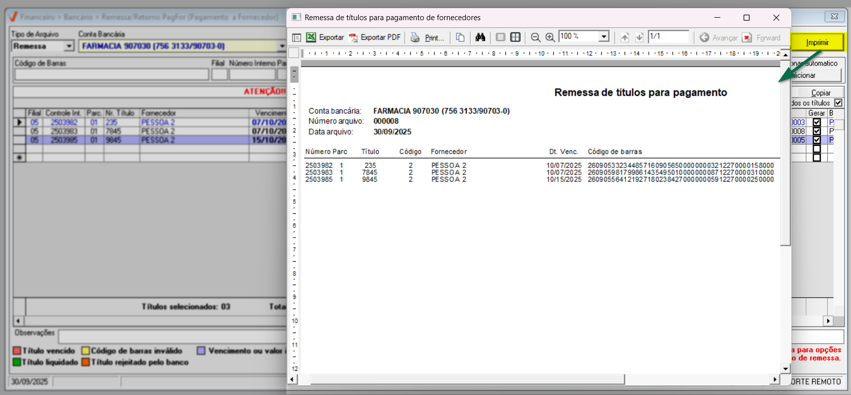 - Imprimir lista de registros que compõem a remessa: Para acessar essas informações, clique no botão >> "Imprimir". Com isso, o relatório será exibido em uma nova tela, permitindo exportação para "Excel" e "PDF", além de oferecer a opção de impressão.