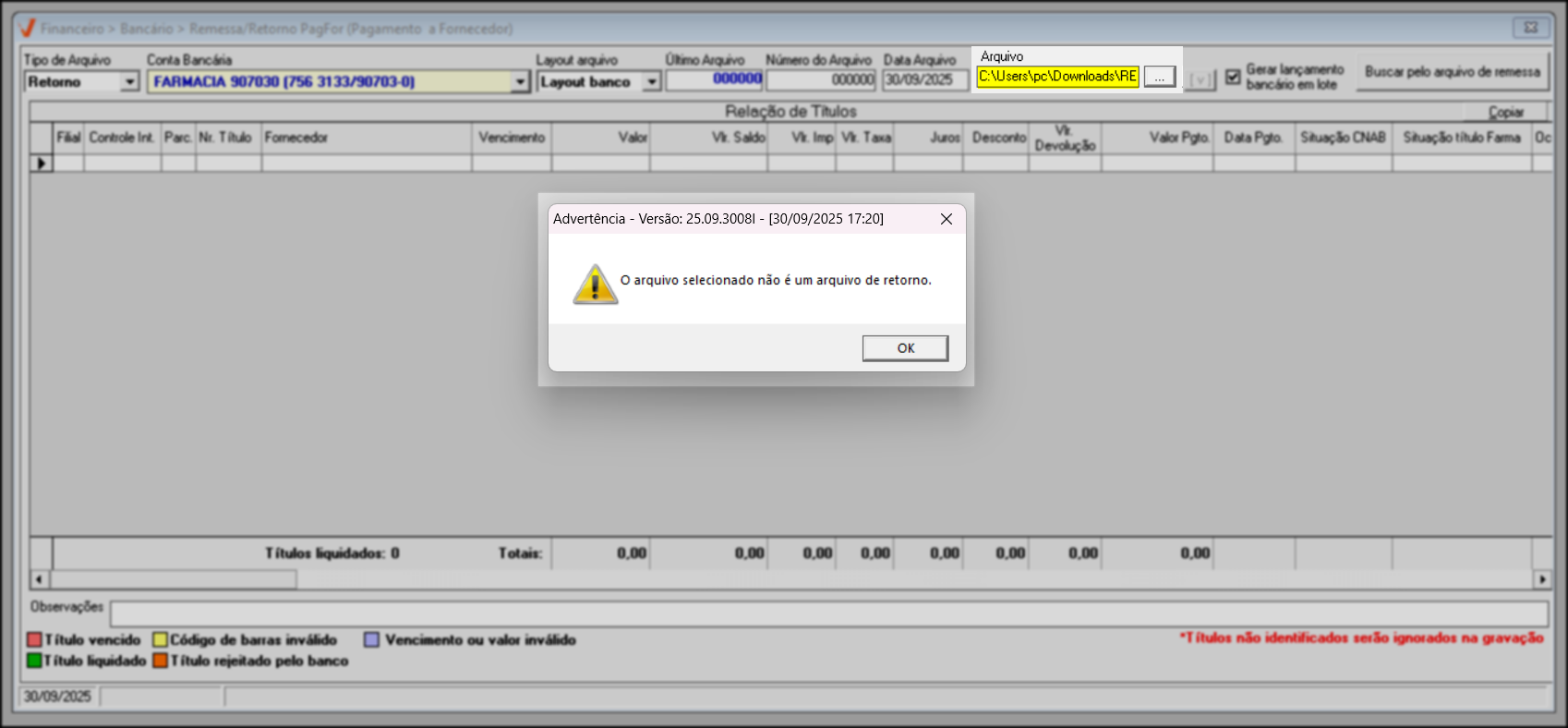 Caso nenhum título seja apresentado na relação durante o processamento do arquivo, é possível que o arquivo esteja vazio, ou que não seja um arquivo de retorno. Outro cenário possível é a seleção de uma conta bancária que não esteja associada ao arquivo, o que resultará na exibição de uma mensagem de alerta informando a incompatibilidade. Nesse caso, recomenda-se selecionar a conta bancária correta e realizar novamente a busca pelo arquivo. Para qualquer inconsistência, o sistema exibirá uma mensagem de alerta na tela. Veja um exemplo: