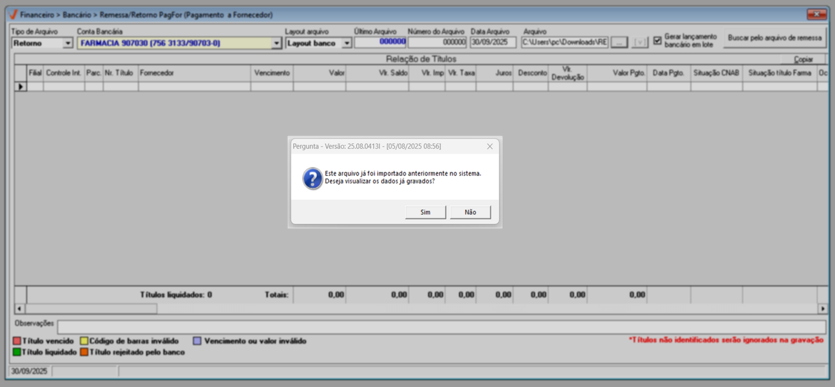 Caso nenhum título seja apresentado na relação durante o processamento do arquivo, é possível que o arquivo esteja vazio, ou que não seja um arquivo de retorno. Outro cenário possível é a seleção de uma conta bancária que não esteja associada ao arquivo, o que resultará na exibição de uma mensagem de alerta informando a incompatibilidade. Nesse caso, recomenda-se selecionar a conta bancária correta e realizar novamente a busca pelo arquivo. Por outro lado, se o arquivo já tiver sido importado anteriormente no sistema, será exibido um alerta informando essa condição e perguntando se o usuário deseja visualizar os dados já gravados. Caso o usuário confirme, os dados previamente importados serão exibidos na seção inferior da tela.