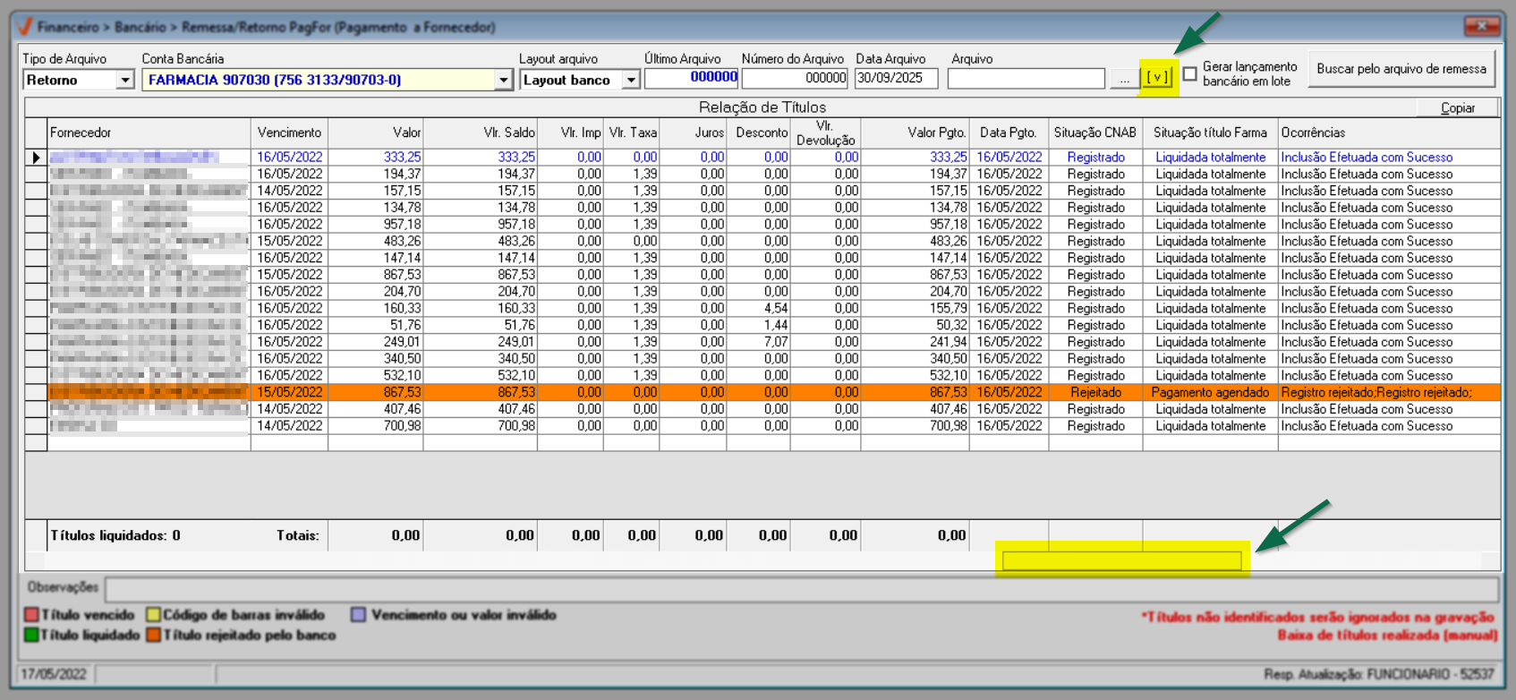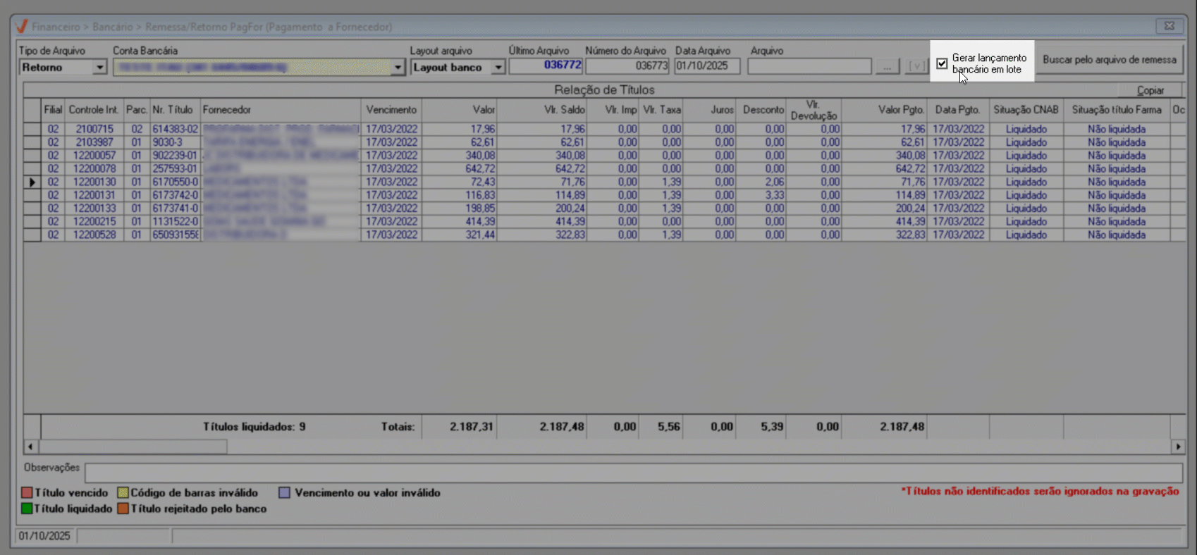 Após importar um novo arquivo de retorno, ou detalhar os dados de um arquivo já importado, cada documento processado no retorno serão exibidos na seção "Relação de títulos".