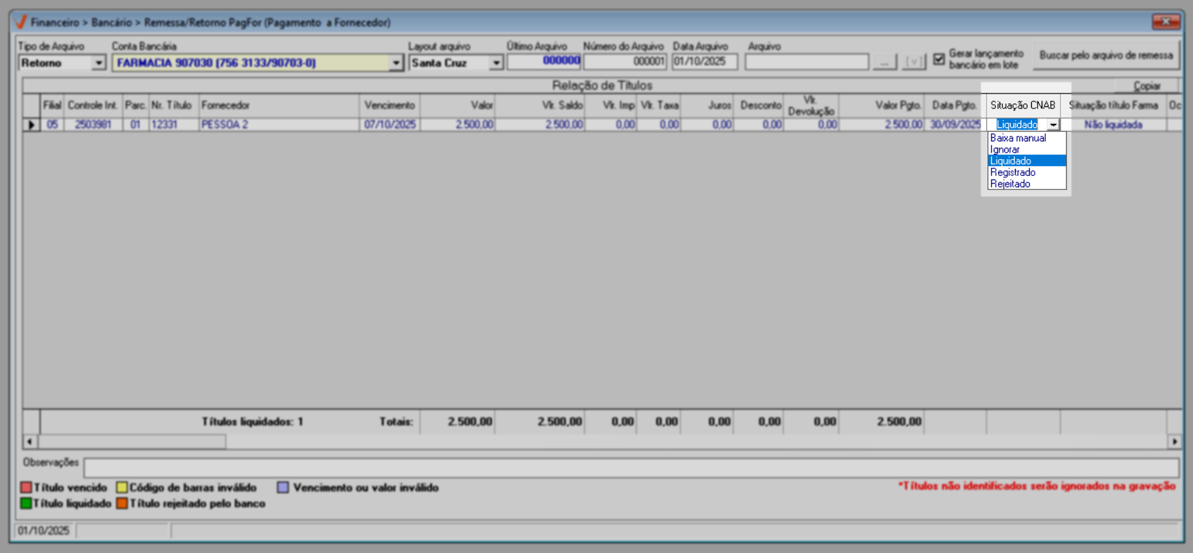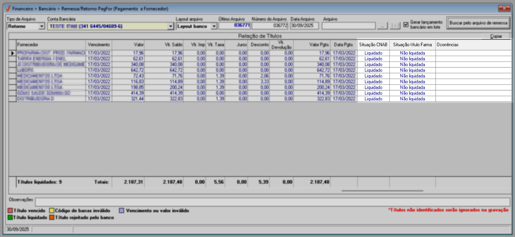 Observe que na relação de títulos, existem duas colunas para indicar a situação do documento, são elas: a coluna "Situação CNAB" e "Situação Título Farma". A principal diferença entre elas está no tipo de informação apresentada. Na coluna "Ocorrências", será possível verificar, quando existirem, o motivo associado à situação registrada para cada título.