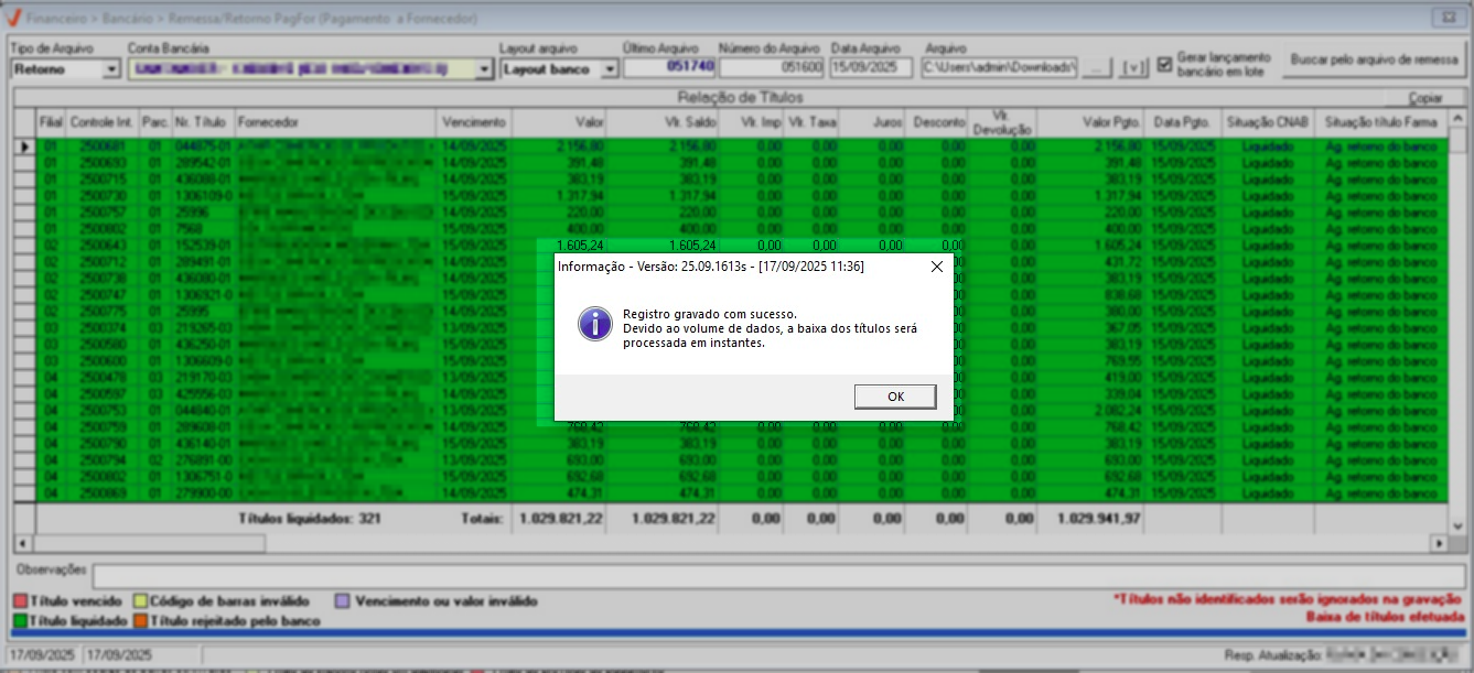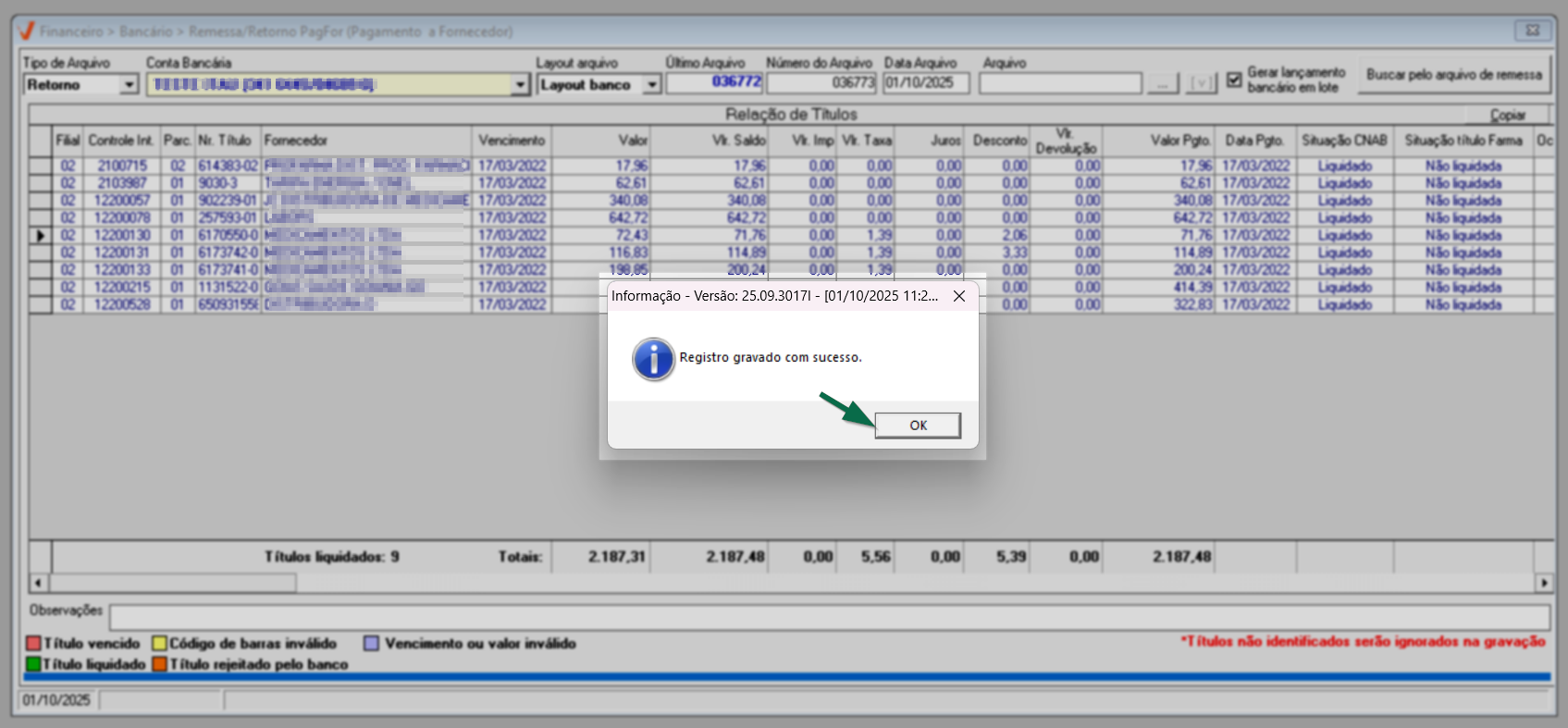 Ao confirmar a mensagem, os títulos serão liquidados no sistema de forma automática e uma mensagem de sucesso será exibida.