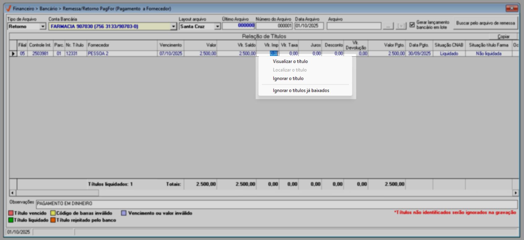 Por outro lado, se a remessa já incluir títulos liquidados, mas houver necessidade de remover um título que ainda não está liquidado, basta clicar com o botão direito do mouse sobre o título desejado e selecionar a opção "Remover título da remessa", veja um exemplo abaixo: