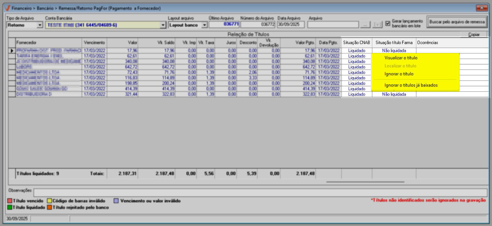 Na relação de títulos, note que a coluna "Situação CNAB" exibirá o status do título conforme o retorno do arquivo lido, enquanto a coluna "Situação Título Farma" divulgará a situação registrada para o título no sistema Vetor Farma. E quando houver, na coluna "Ocorrências", será possível verificar o motivo associado à situação registrada para cada título.