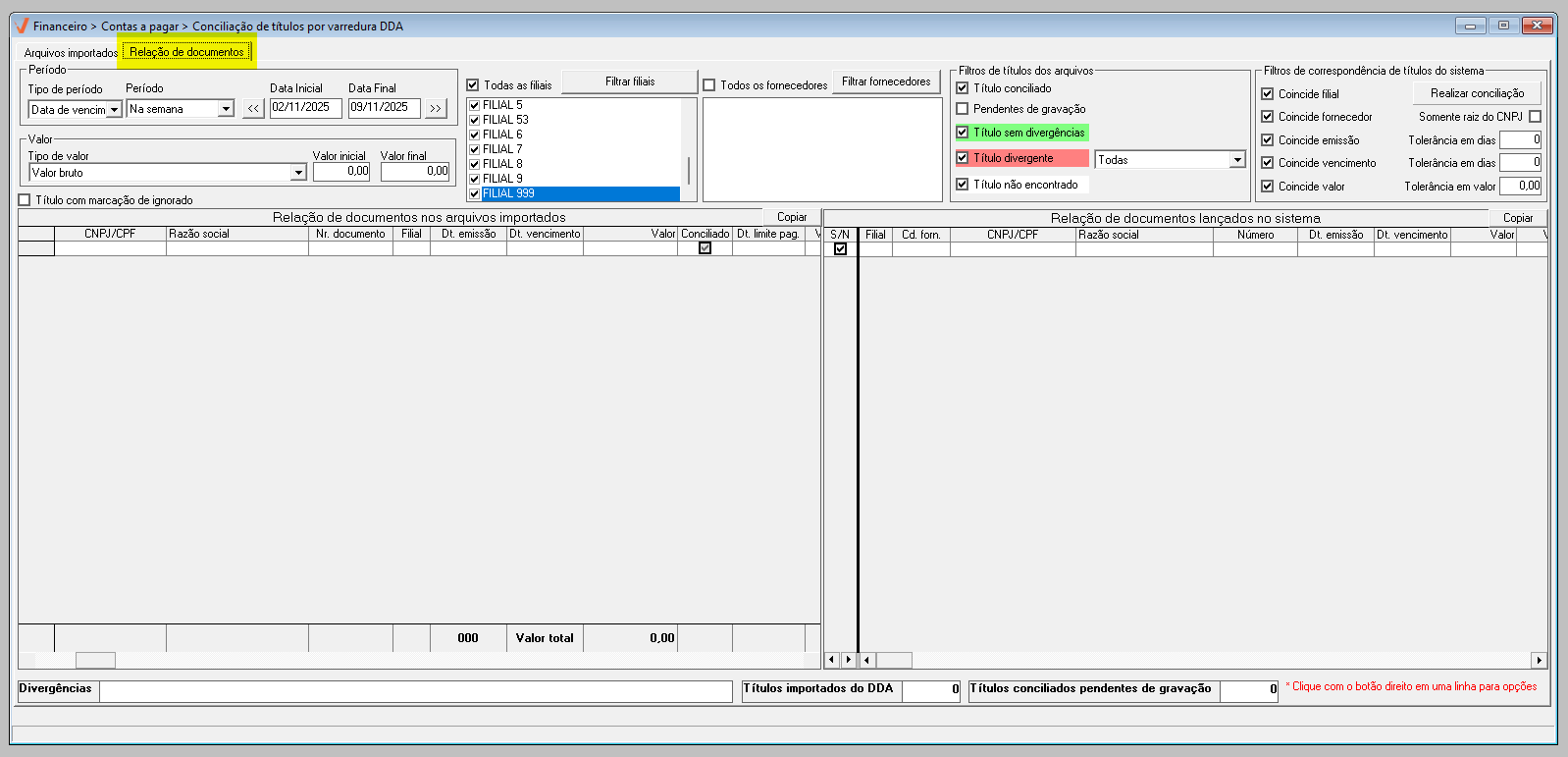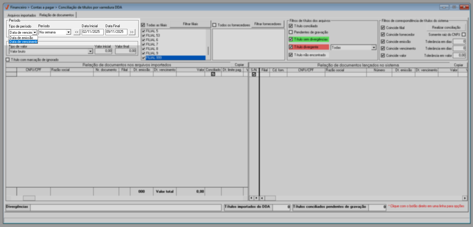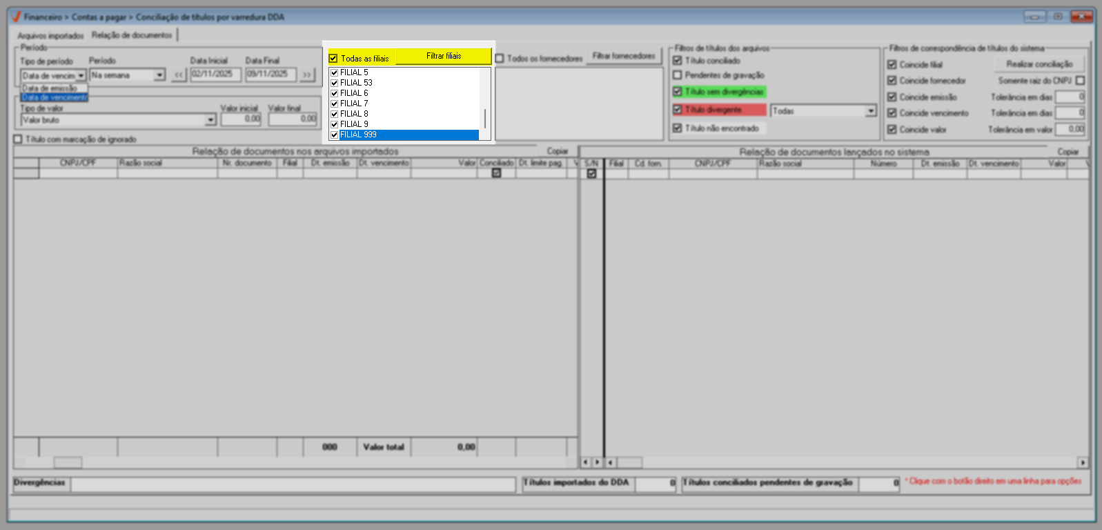 Em resumo, os filtros de correspondência permitem flexibilizar a conciliação de títulos, possibilitando considerar registros com datas de vencimento ou emissão até alguns dias antes ou depois da informada, aceitar valores com pequenas variações em relação ao valor importado e conciliar títulos de um mesmo fornecedor mesmo quando o sufixo do CNPJ for diferente, por meio da opção “Somente raiz do CNPJ”, tornando o processo mais ágil e preciso.