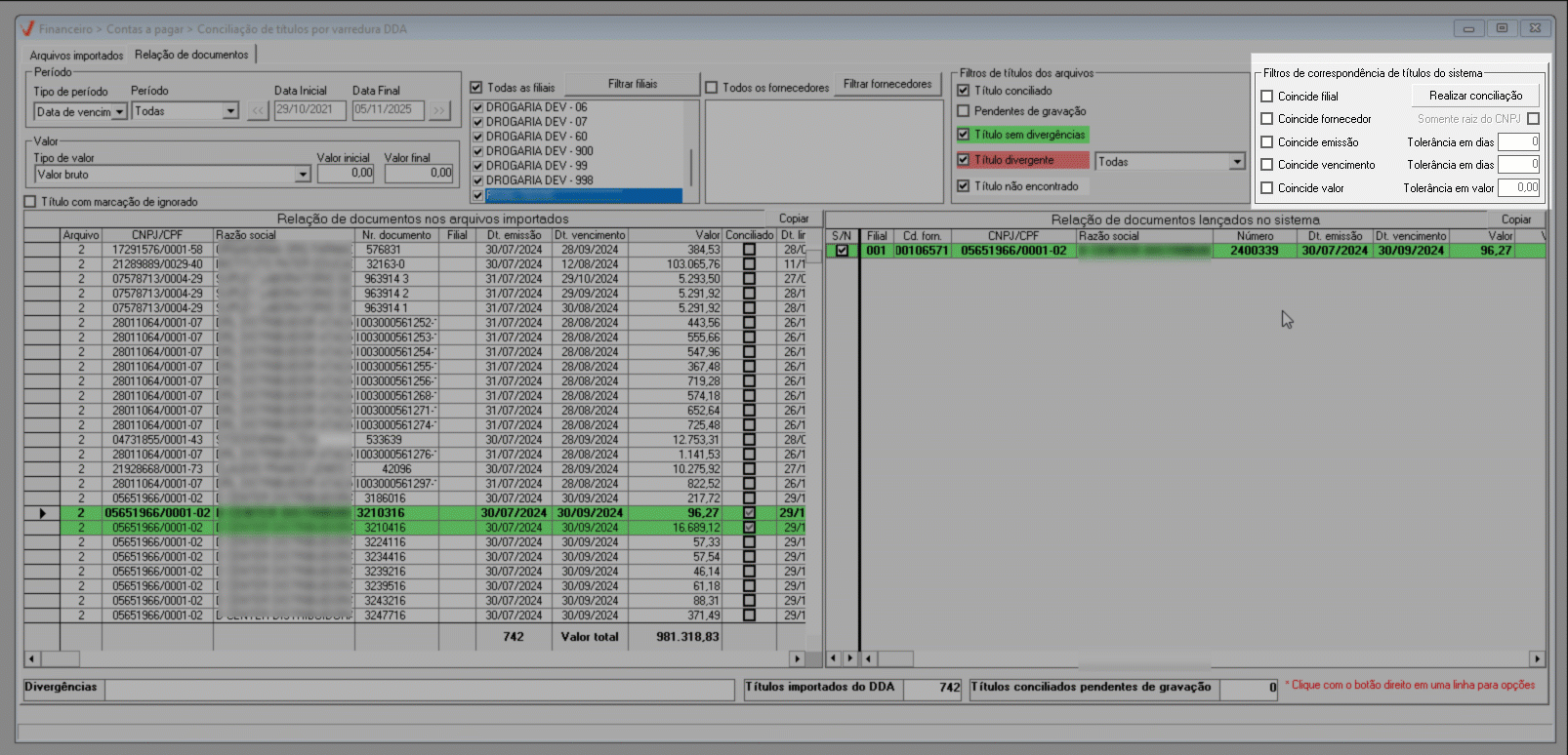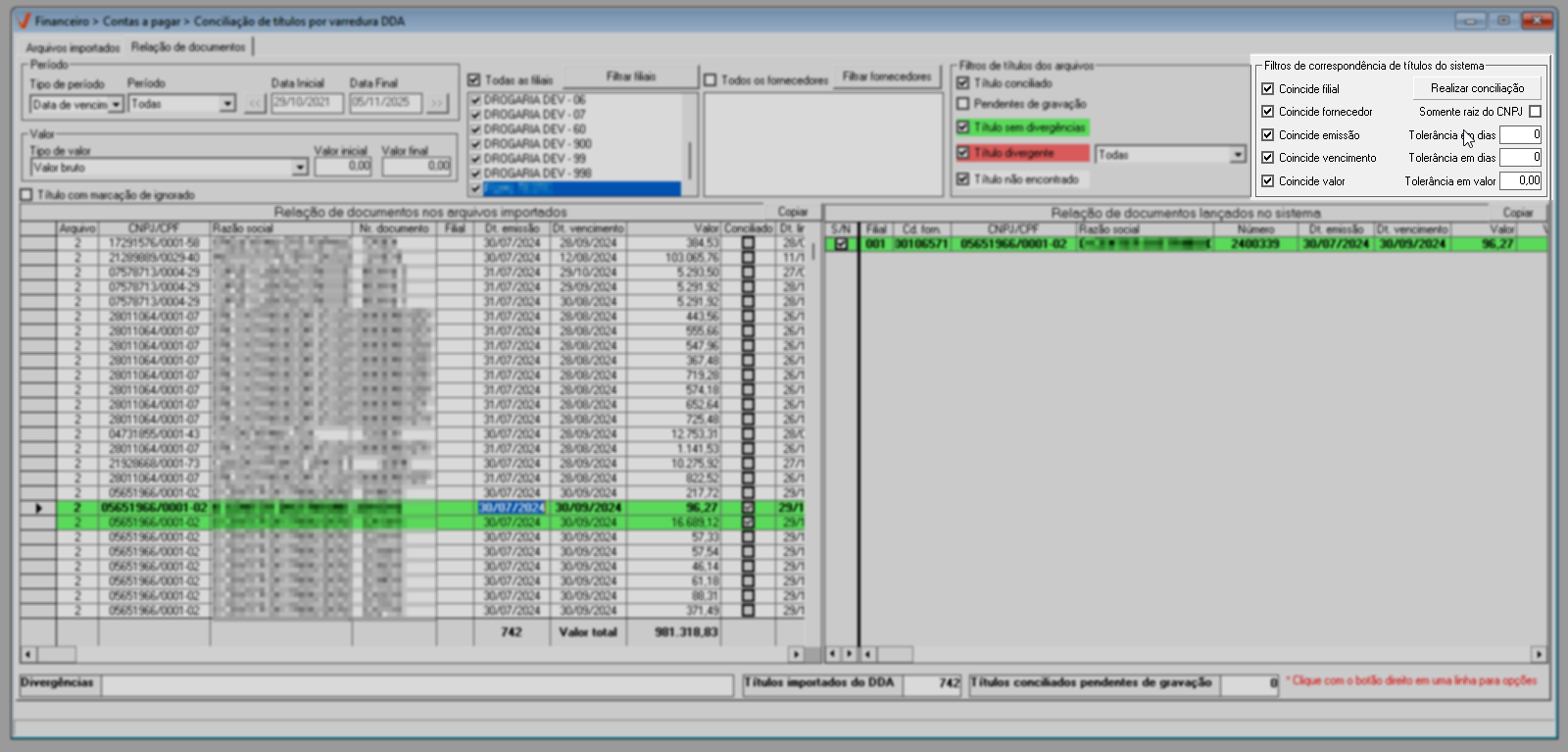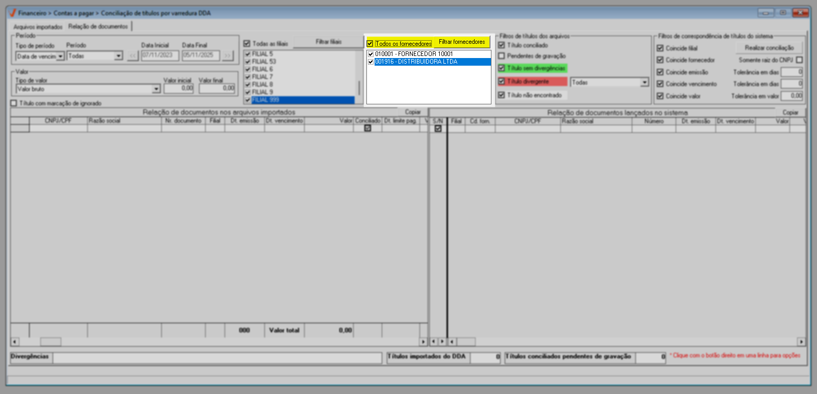 Em resumo, os filtros de correspondência permitem flexibilizar a conciliação de títulos, possibilitando considerar registros com datas de vencimento ou emissão até alguns dias antes ou depois da informada, aceitar valores com pequenas variações em relação ao valor importado e conciliar títulos de um mesmo fornecedor mesmo quando o sufixo do CNPJ for diferente, por meio da opção “Somente raiz do CNPJ”, tornando o processo mais ágil e preciso.