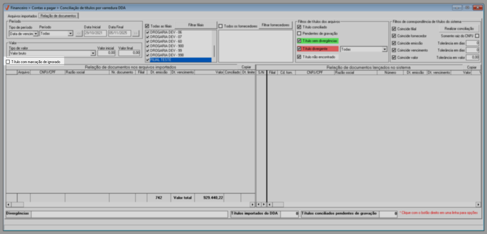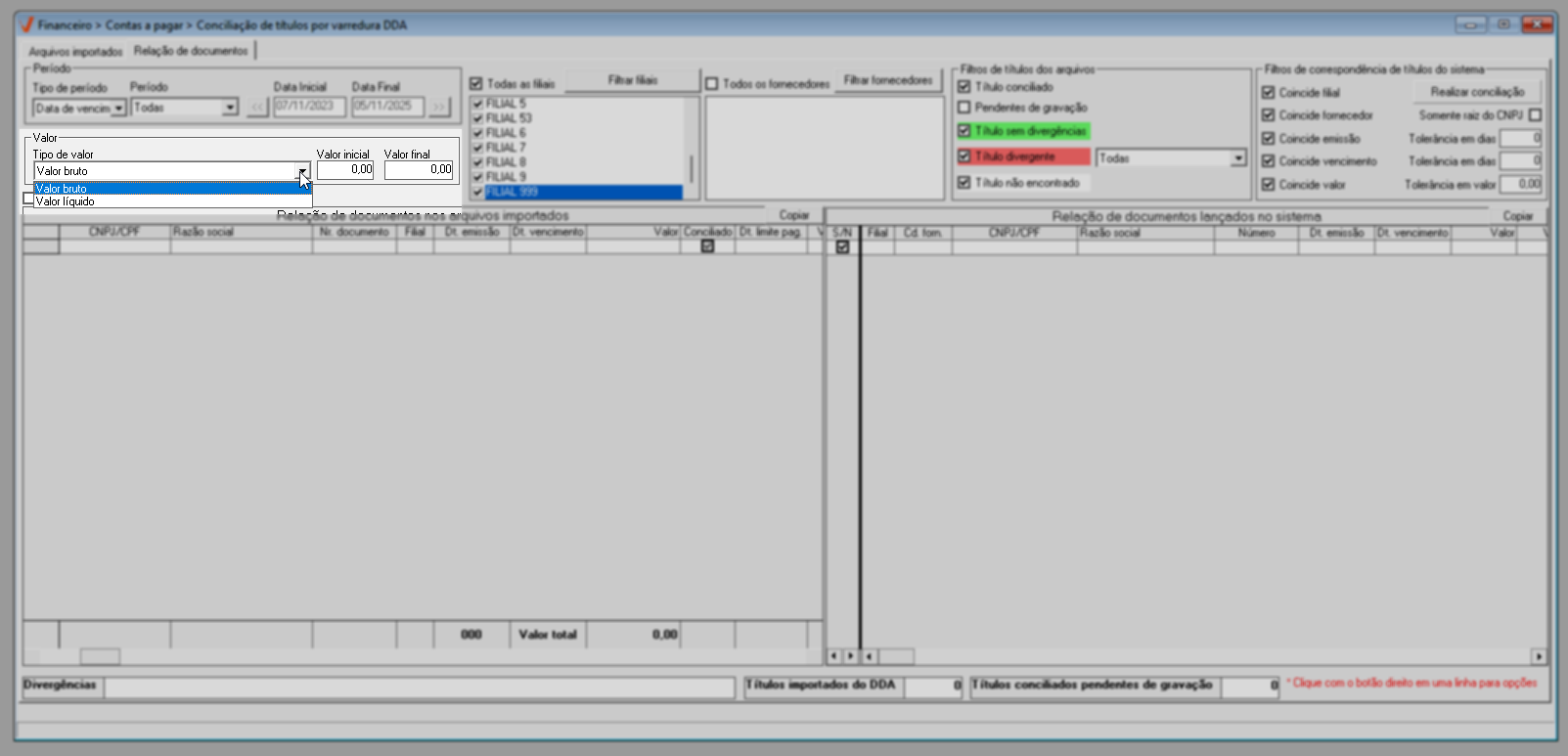 - Coincide valor: Valida os valores dos títulos. Essa opção quando marcada habilita o filtro "Tolerância em valo" que permite estabelecer uma variação monetária máxima entre os valores dos títulos comparados, útil para casos em que pequenas diferenças possam ocorrer.