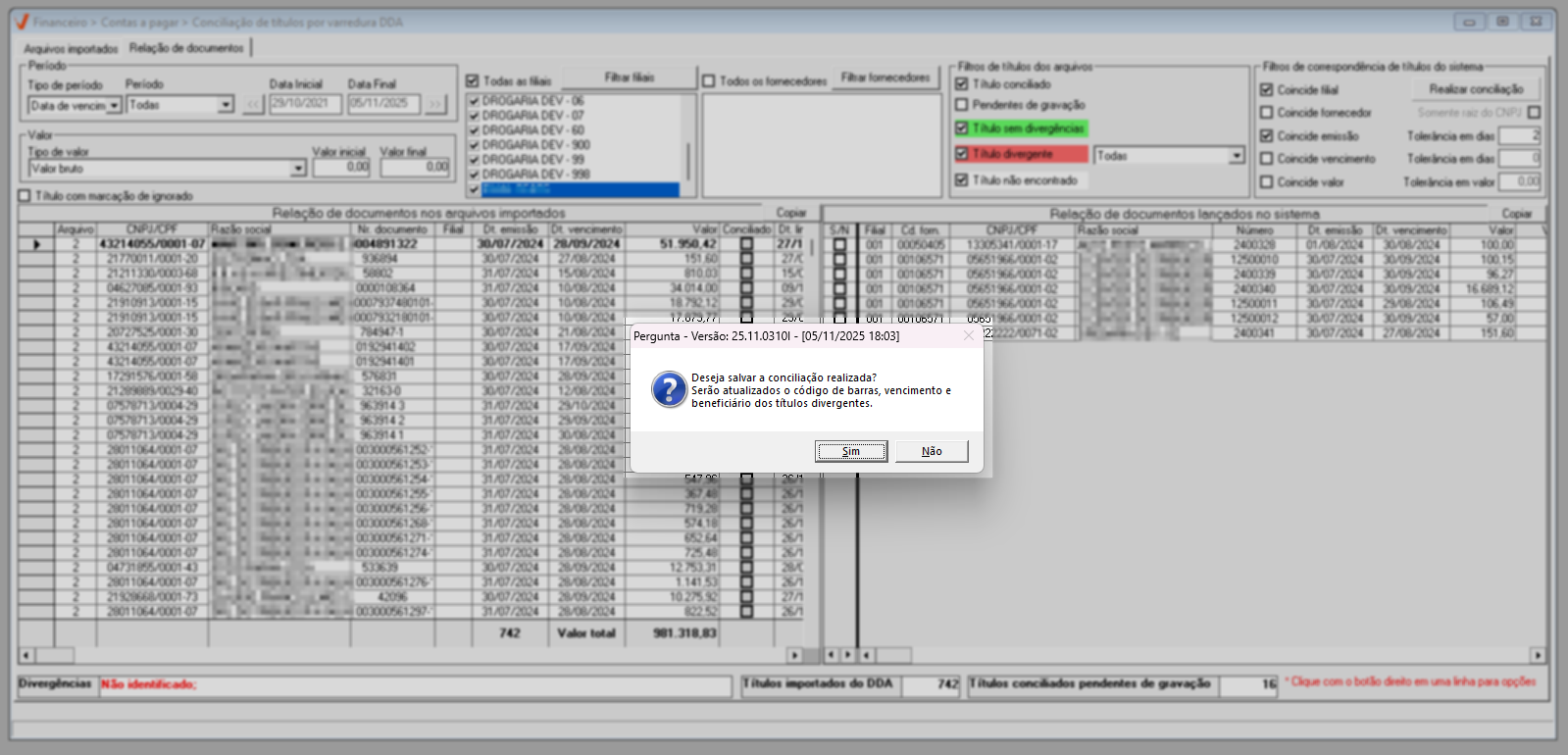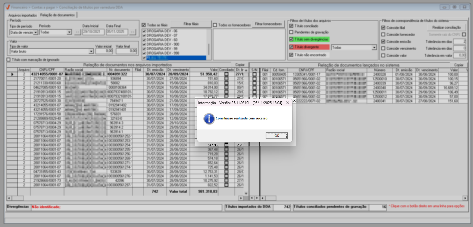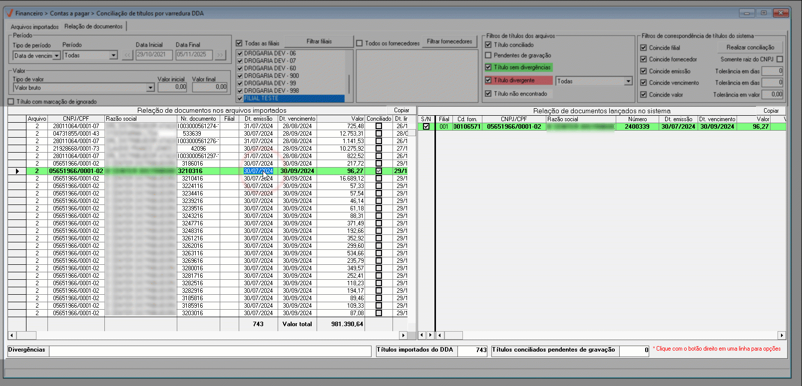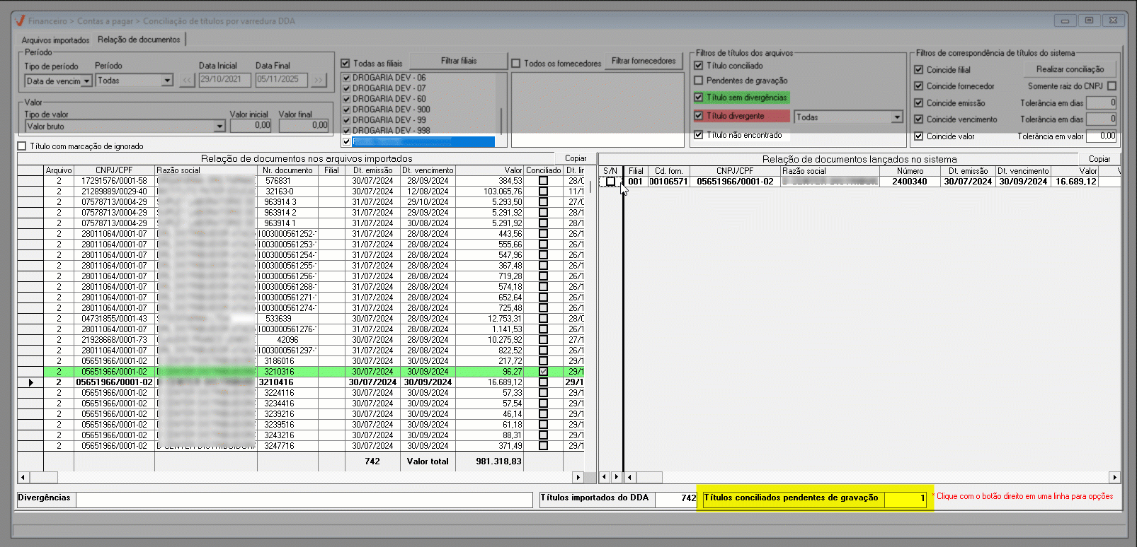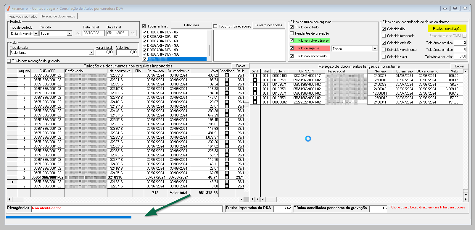 Conciliação registros de filiais diferentes