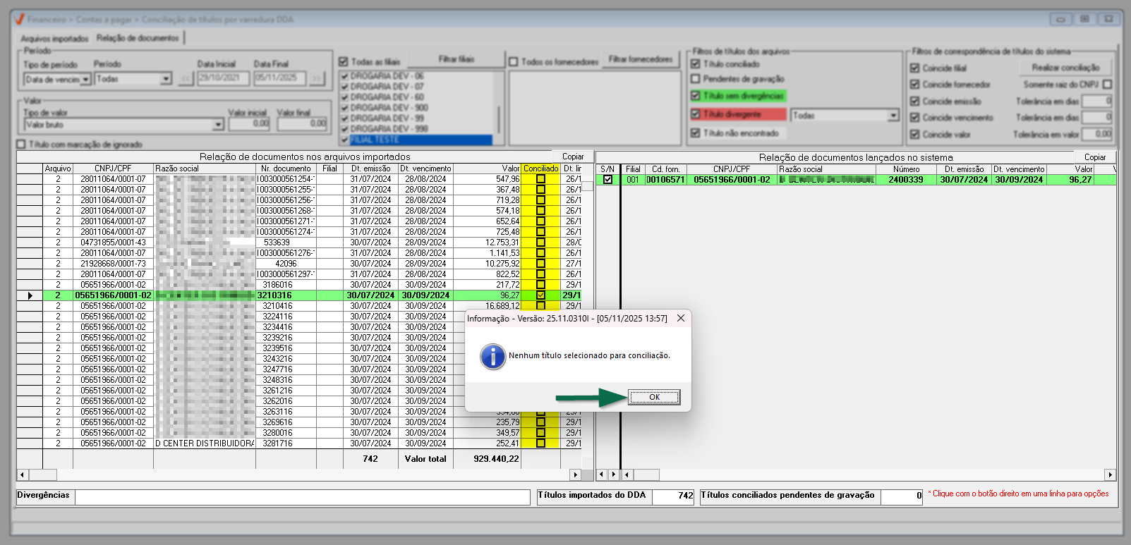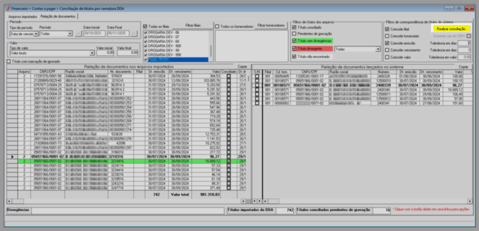 Para finalizar, combinados aos filtros de correspondência, está disponível o botão >> "Realizar conciliação", que executa automaticamente a reconciliação dos títulos cujo status esteja definido como "Título não encontrado".