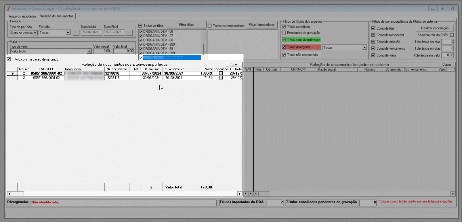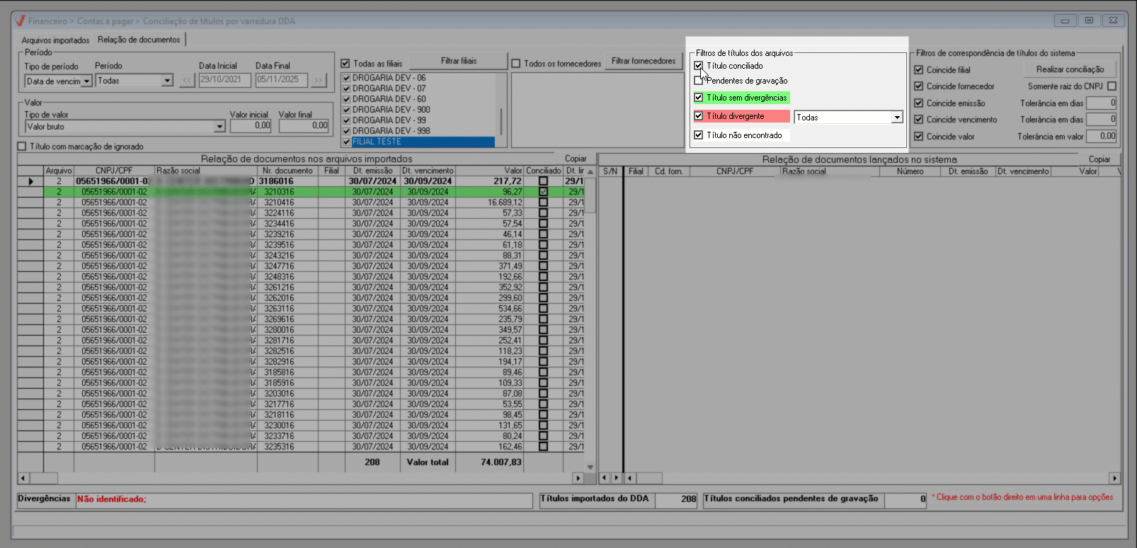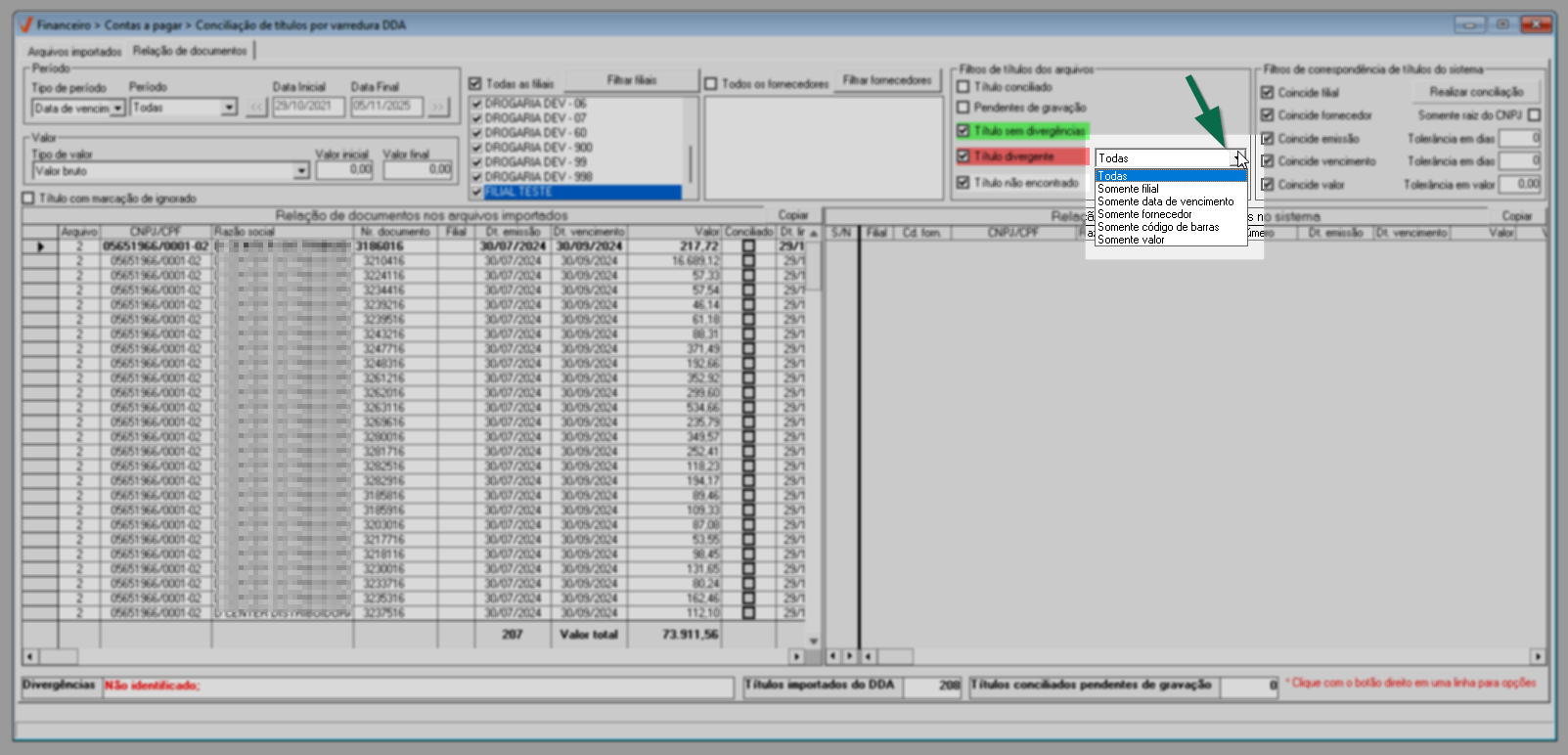 - Filtro: Títulos dos Arquivos: Ao lado da opção de consulta "Título Divergente", o usuário pode definir filtros específicos para buscar apenas determinados tipos de registros para a análise e correção, se necessário. Por exemplo: somente títulos de uma filial específica, documentos cuja data de vencimento coincida com a informada no filtro por período, ou registros de um fornecedor específico, entre outros. Em outras palavras, o usuário pode restringir a consulta de títulos divergentes de acordo com apenas um desses critérios.