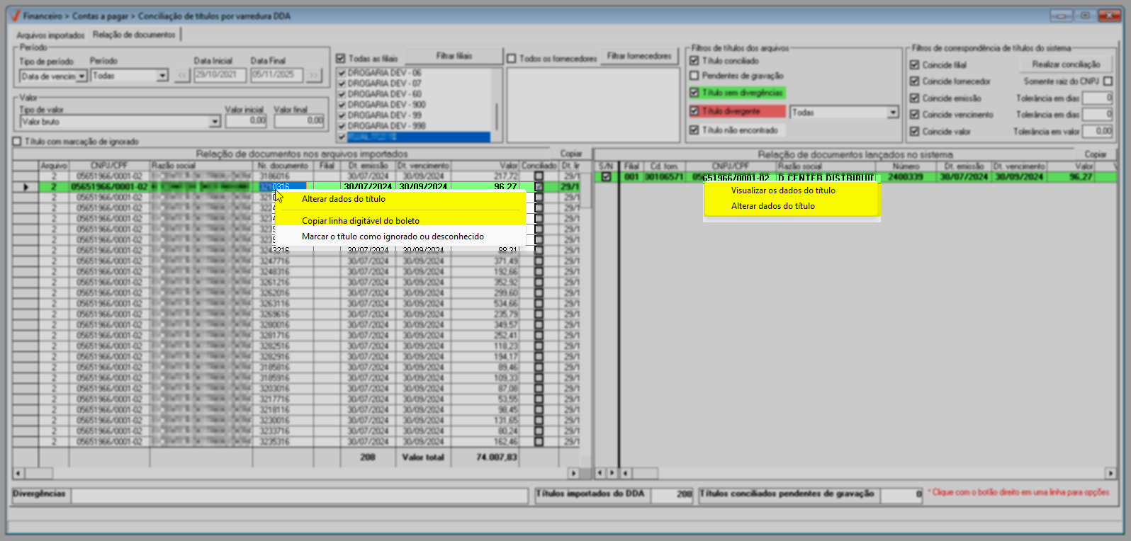 Mesmo diante dessa diferença, o sistema reconhece automaticamente o valor da taxa registrado internamente e soma essa taxa ao valor do documento recebido via DDA, assegurando que a conciliação ocorra corretamente e sem inconsistências.