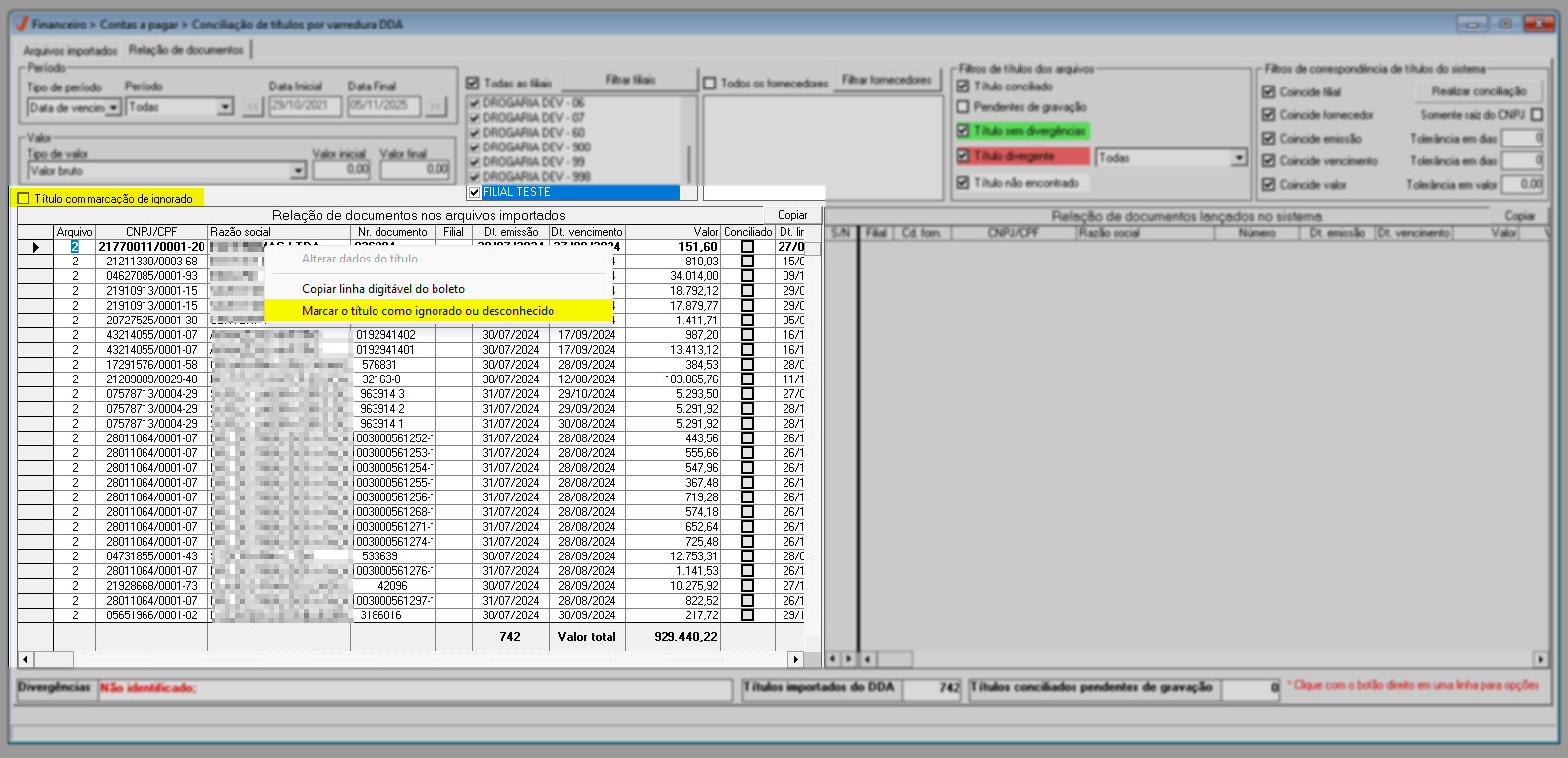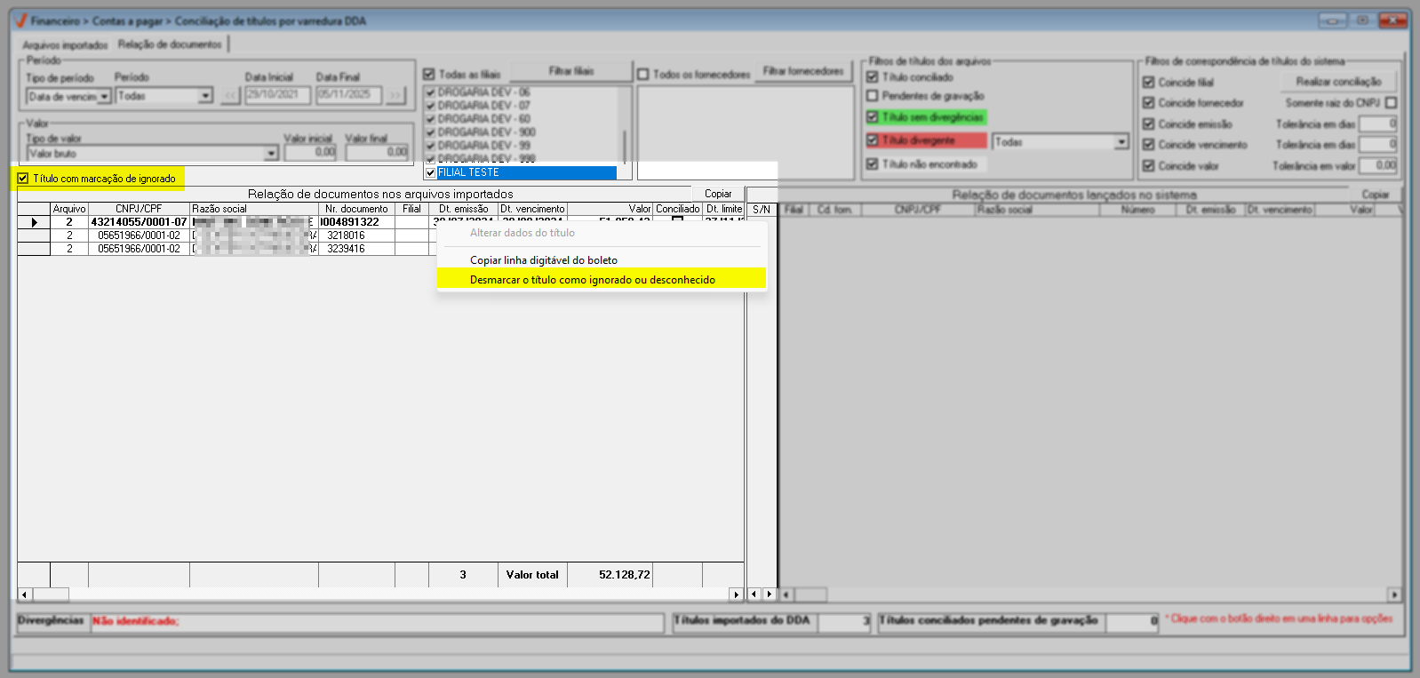 Quando o filtro não estiver selecionado, o menu apresentará a opção “Marcar título como Ignorado ou desconhecido”. Neste caso, se o usuário desejar identificar e ignorar títulos que não serão pagos, basta clicar nessa opção.
