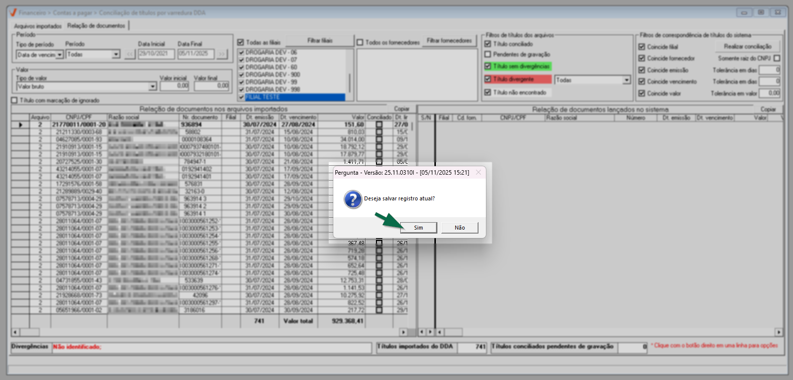 Por fim, após identificar e corrigir o registro e sua correspondência, para realizar a conciliação manual, marque o registro na seção ao lado direito. Para registrar a conciliação dos registros, pressione a tecla de atalho F2 e confirme a mensagem: "Deseja salvar a conciliação realizada? Serão atualizados o código de barras, vencimento e beneficiário dos títulos divergentes.". Após a confirmação, a coluna "Conciliado" do documento em questão será marcada para indicar que o registro foi conciliado.