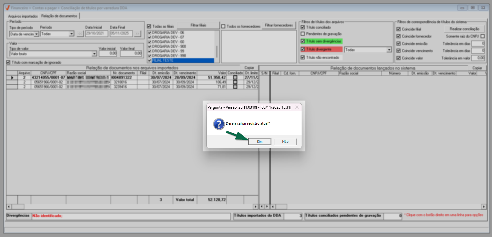 Desta forma. Para facilitar a identificação dos registros, os títulos que não apresentam divergências serão destacados com a legenda de cor verde e terão a coluna "Conciliado" marcada automaticamente. Além disso, uma legenda específica será exibida para indicar que os registros estão pendentes de gravação. Para concluir o processo e salvar a conciliação, basta pressionar o atalho F2 e confirmar a operação.
