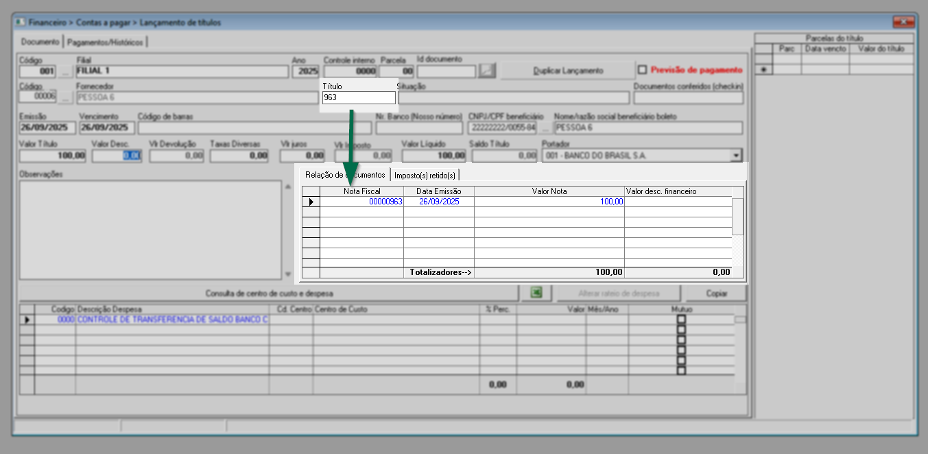 Na aba "Relação de Documentos", assim que o "Valor do Título" for informado, o sistema destacará automaticamente o título que está sendo lançado. Serão exibidos os seguintes dados relacionados: número da nota fiscal, data de emissão, valor da nota e se houver, valor de desconto financeiro.