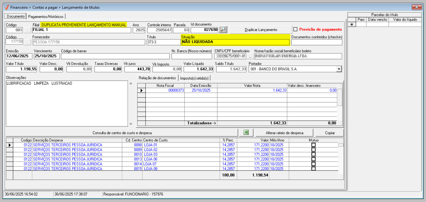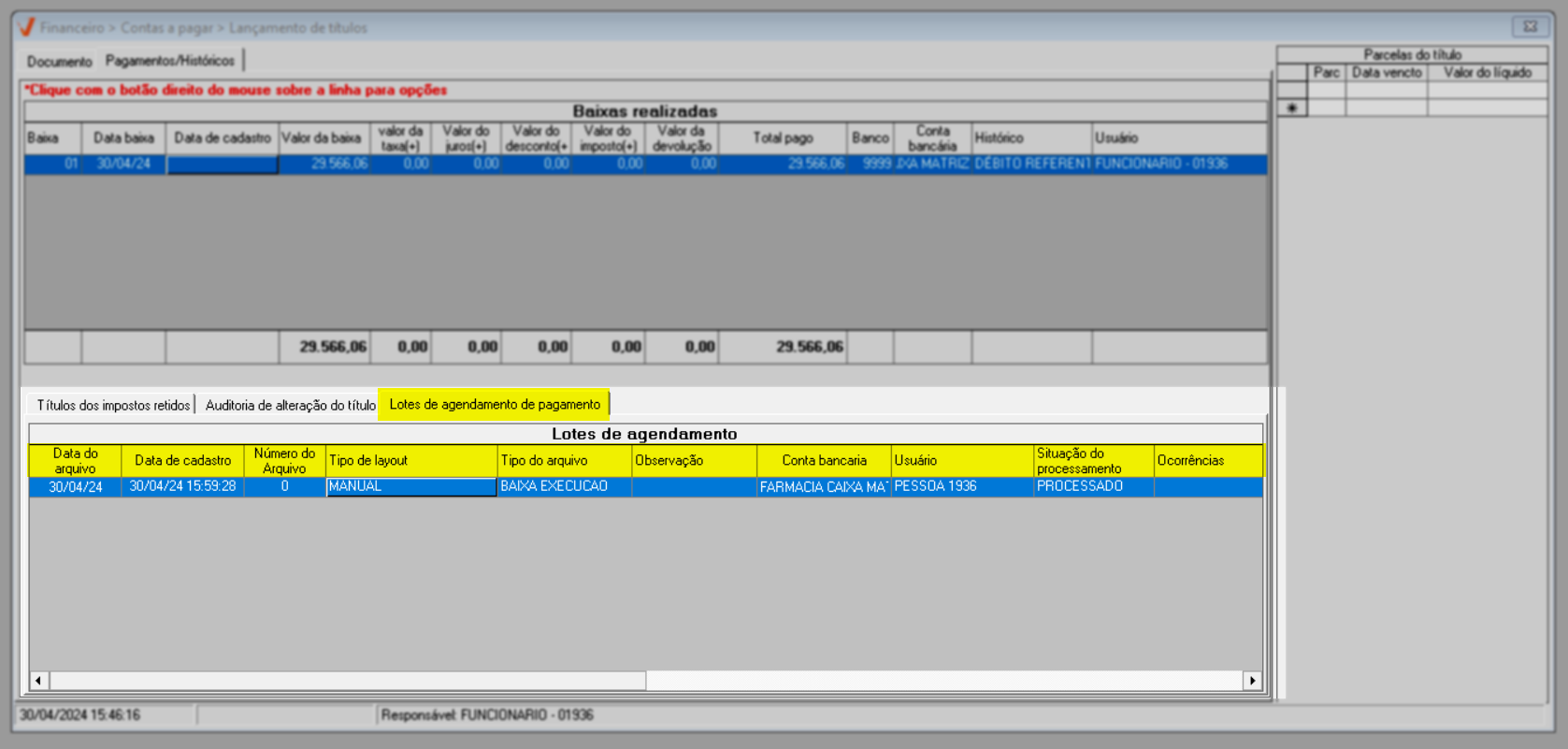 Após a seleção, o título será carregado na tela, observe que é possível visualizar se a parcela é proveniente de um lançamento manual e identificar a situação da parcela: