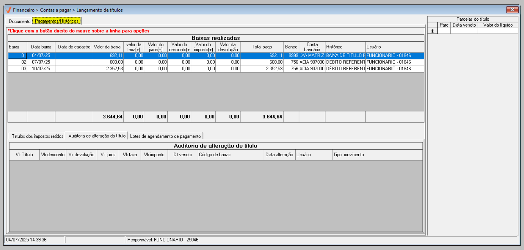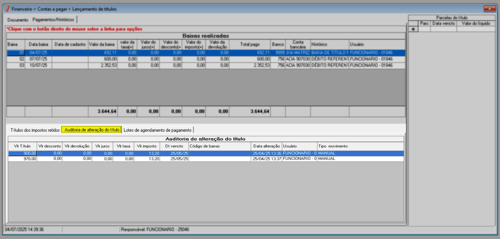 Para fins de controle, na aba “Auditoria de alteração do título” são exibidas todas as movimentações de alteração registradas para o título por meio da tela “Alteração de títulos”. Essa aba permite acompanhar de forma transparente cada modificação realizada no registro. Confira o exemplo a seguir:
