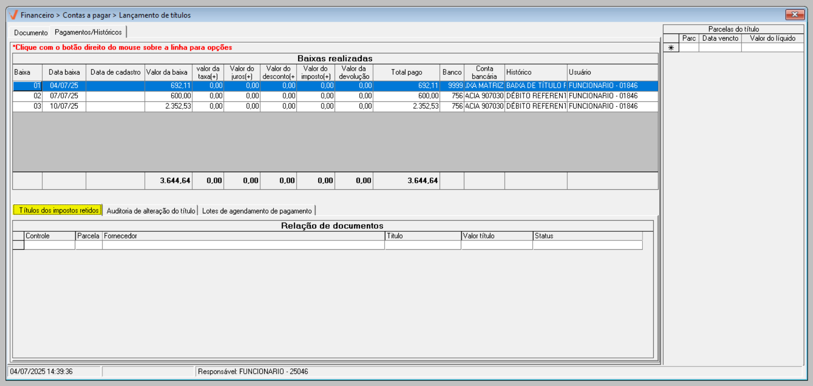 Para aprimorar a análise do título consultado, a aba “Pagamentos/Históricos” apresenta duas seções que permitem visualizar as baixas realizadas, consultar os registros referentes a impostos retidos (quando houver), visualizar todas as alterações efetuadas no lançamento, além de conferir a relação de baixas, facilitando o acompanhamento completo das movimentações e do processamento do título.