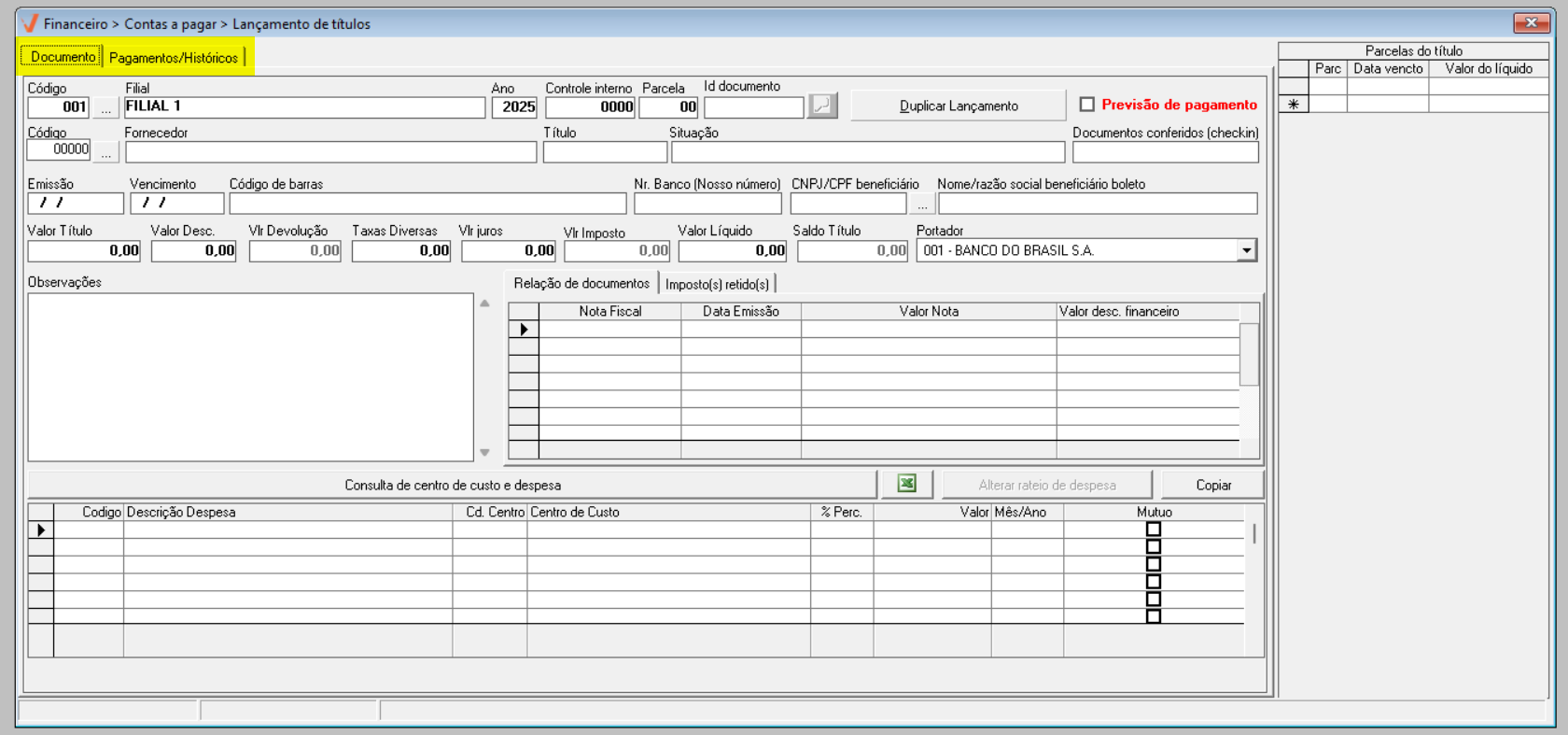 Ao acessar a tela, o usuário encontrará duas abas principais. A primeira, "Documento", é utilizada para registrar os dados de um novo título a pagar, além de permitir a pesquisa de lançamentos já existentes no sistema. A segunda aba, "Pagamentos/Históricos", é destinada à análise dos títulos registrados. Nela, é possível visualizar as baixas realizadas, consultar os registros referentes a impostos retidos (quando houver), visualizar todas as alterações efetuadas no lançamento, além de conferir a relação de baixas, facilitando o acompanhamento completo das movimentações e do processamento do título. Inicie a operação da tela pela aba "Documento", que é exibida ao abrir a tela.