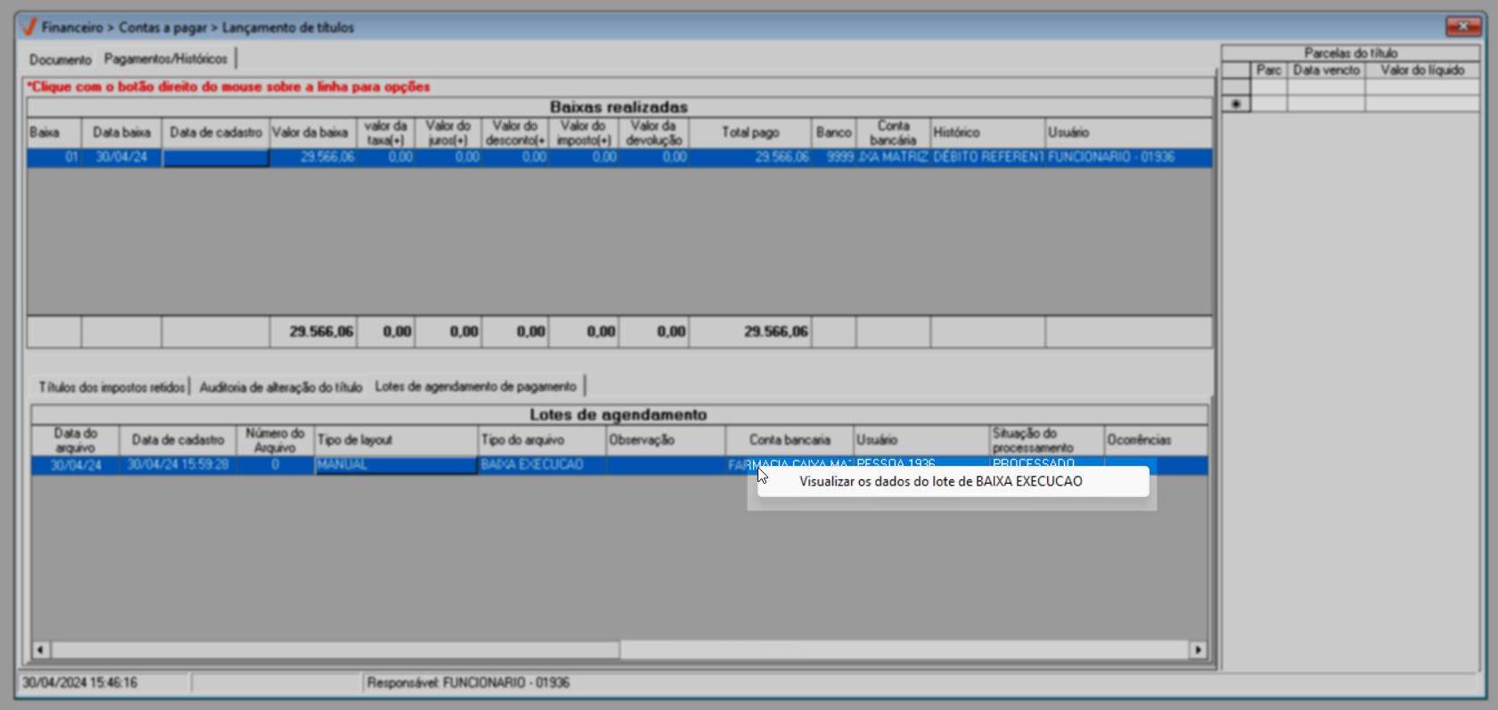 Para aprimorar a análise dos lotes agendados, ao clicar com o botão direito do mouse em um registro, será exibida a opção "Visualizar os dados do lote de ...", ela redireciona o usuário para a tela "Pagamentos/Recebimentos", que contém os detalhes da baixa realizada. Clique aqui para saber mais sobre essa tela.