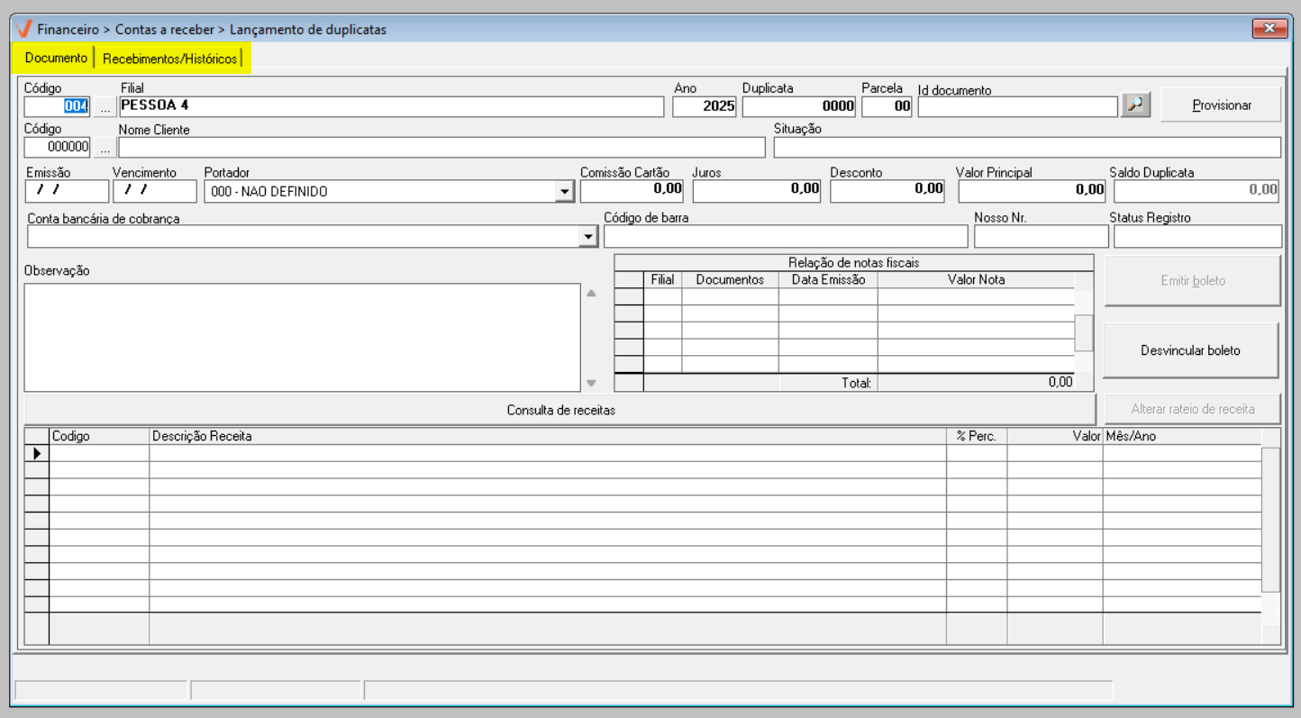 Ao carregar a tela, serão exibidas duas abas. A primeira aba, "Documento", é destinada ao registro de todas as informações referentes ao novo lançamento da duplicata a receber, além de permitir a pesquisa de lançamentos já existentes no sistema. A segunda aba, "Recebimentos/Históricos", fornece informações sobre o histórico de recebimentos associados ao registro, além de exibir o histórico das remessas geradas, quando a empresa estiver habilitada para esta operação. Inicie pela aba "Documento" e veja como realizar um novo lançamento.