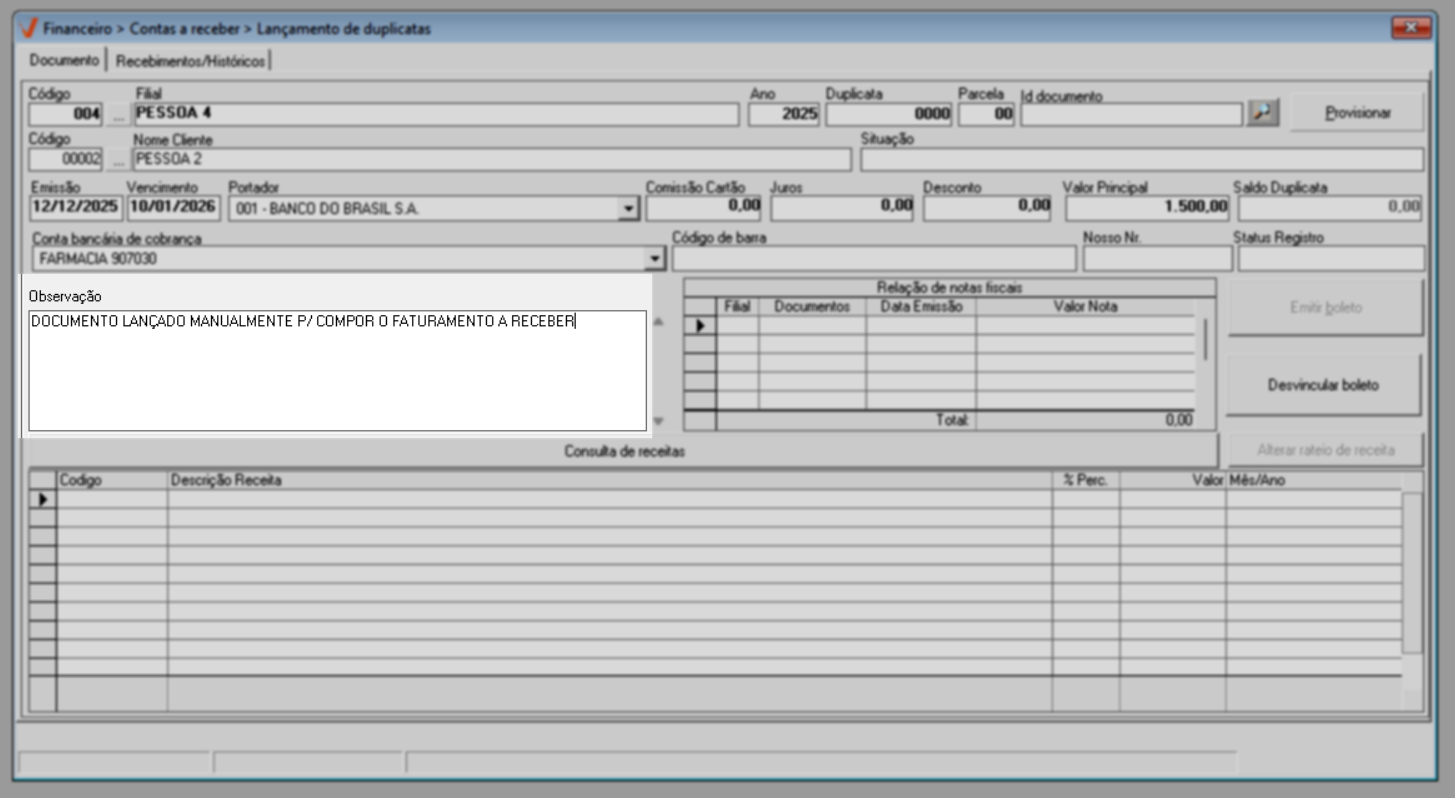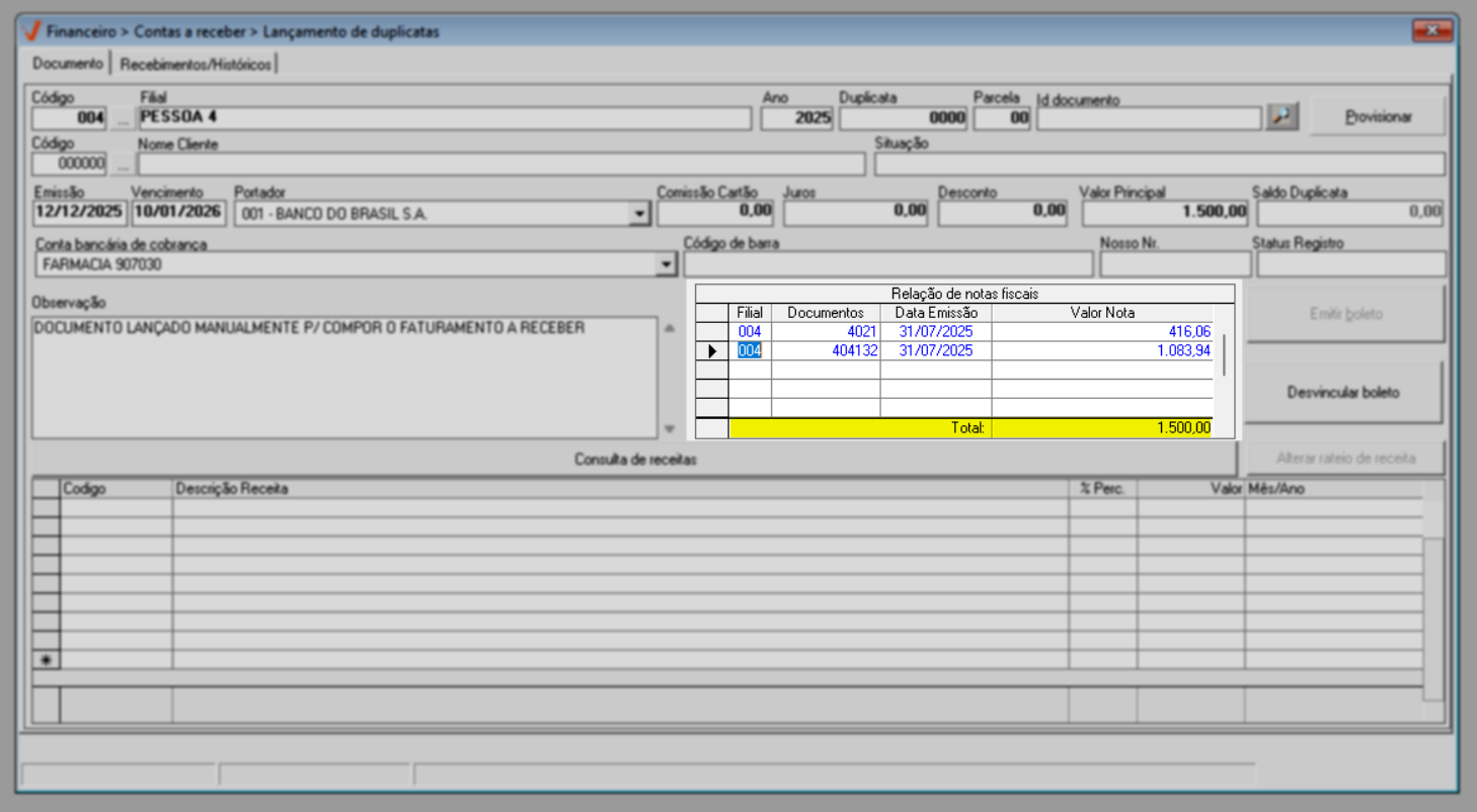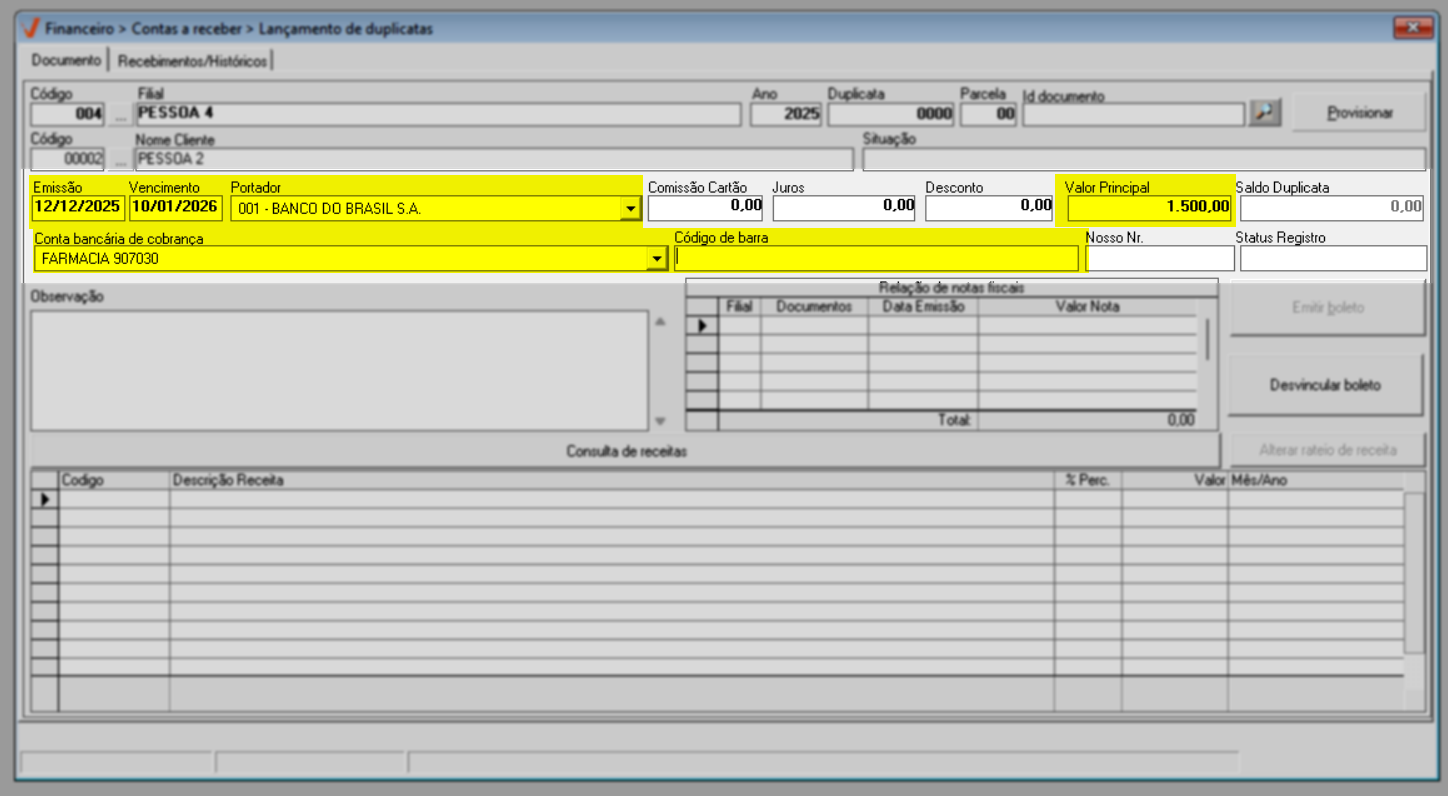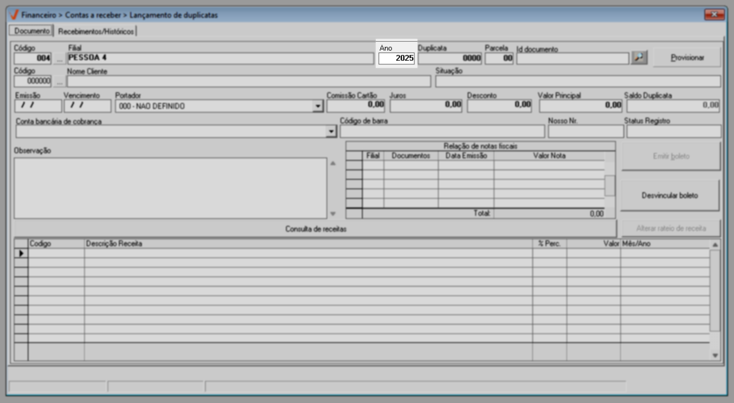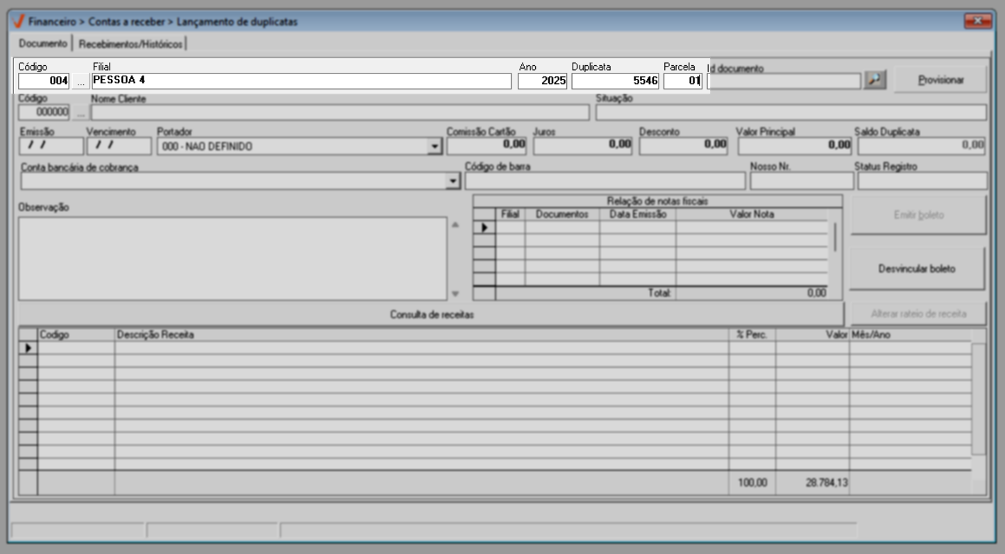 Quando a transação não é registrada automaticamente, como ocorre em migrações de sistema ou na correção de registros, o lançamento do documento deve ser feito manualmente. Nessa situação, o usuário insere diretamente no sistema um novo registro a receber, informando dados como valor, data de vencimento e demais informações necessárias, garantindo que a duplicata seja devidamente registrada e refletida no controle financeiro. Veja a seguir.