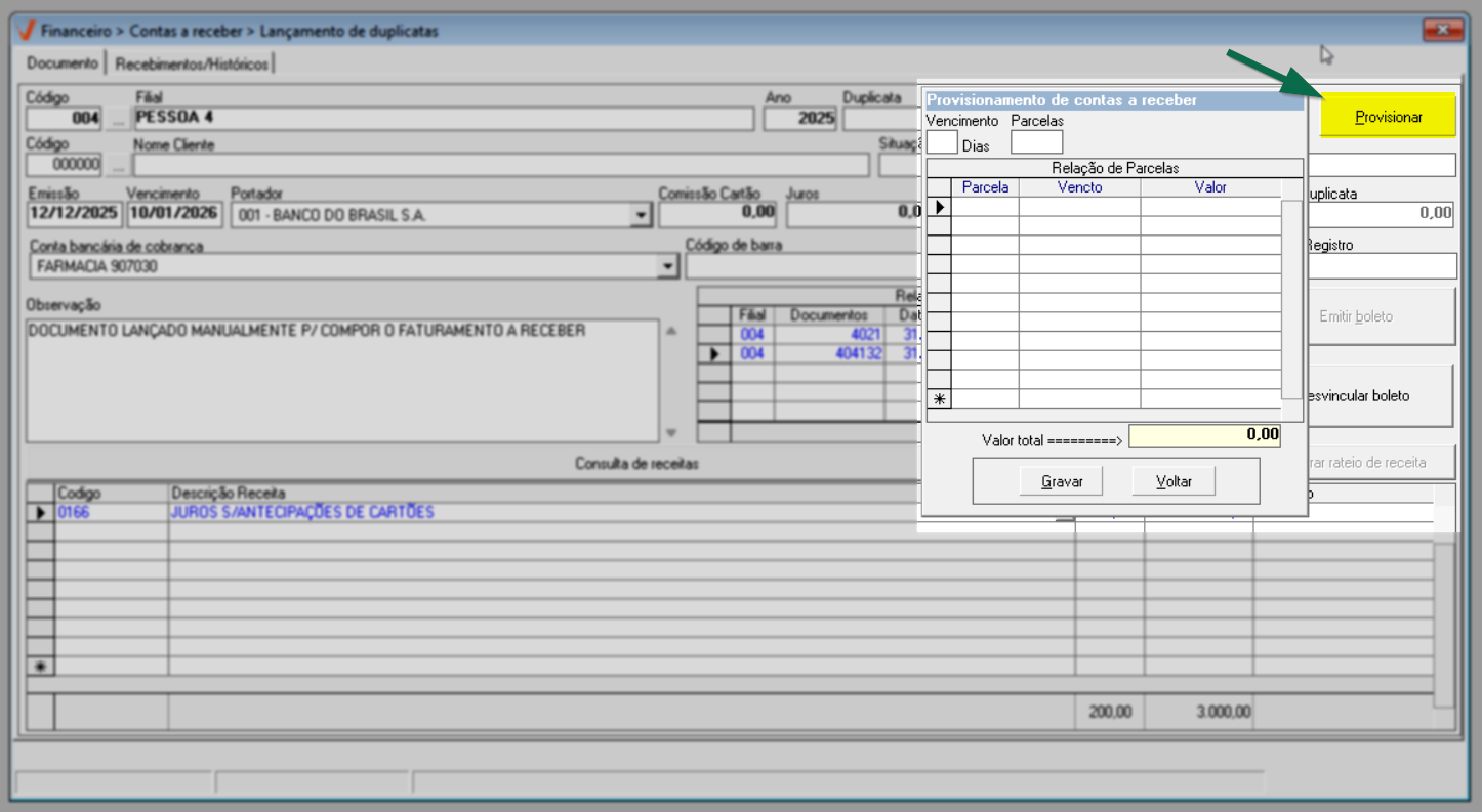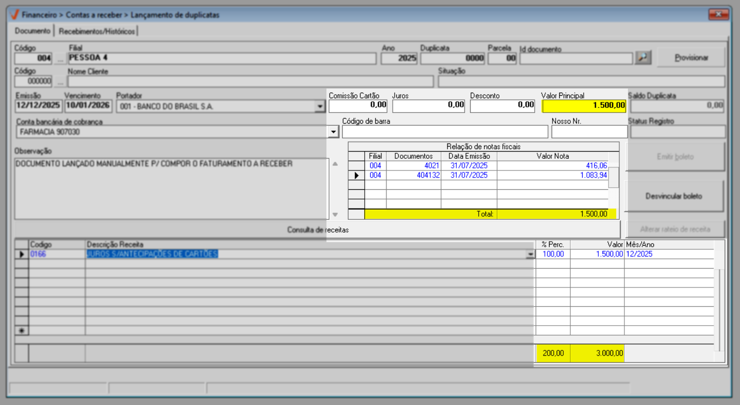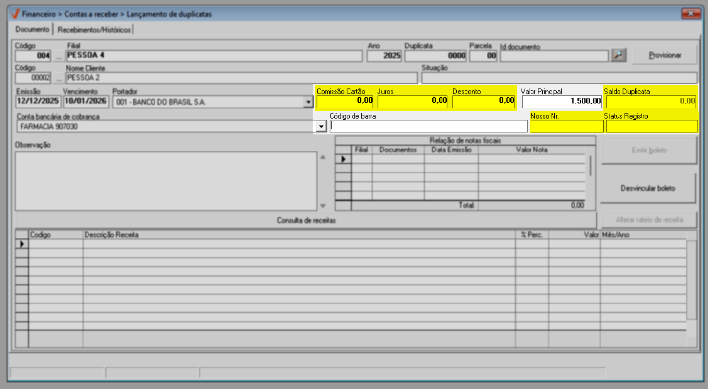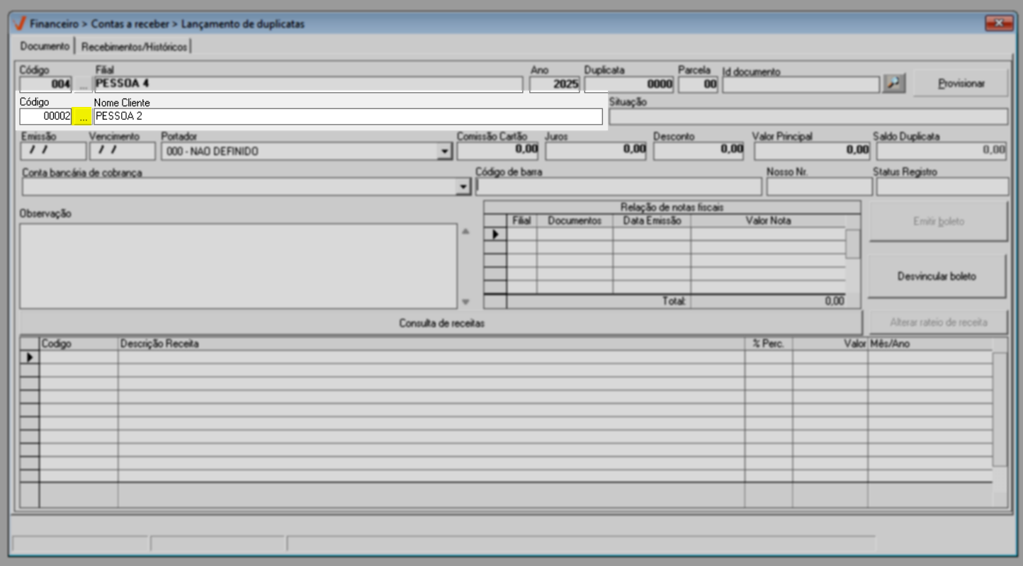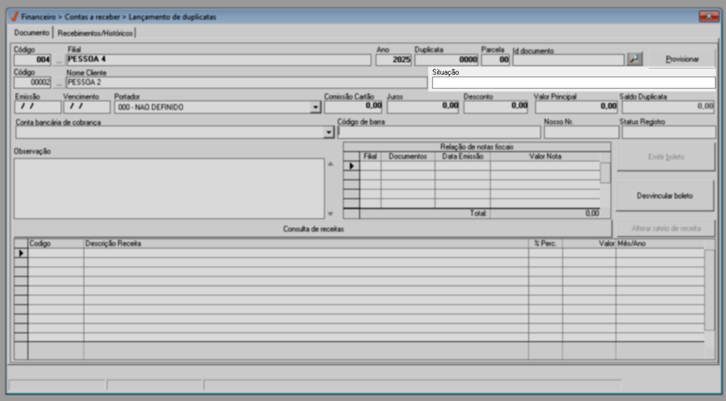 Quando a transação não é registrada automaticamente, como ocorre em migrações de sistema ou na correção de registros, o lançamento do documento deve ser feito manualmente. Nessa situação, o usuário insere diretamente no sistema um novo registro a receber, informando dados como valor, data de vencimento e demais informações necessárias, garantindo que a duplicata seja devidamente registrada e refletida no controle financeiro. Veja a seguir.