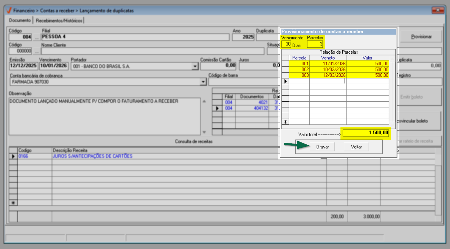 - Acesse o menu: Financeiro >> Contas a receber >> Lançamento de duplicatas.