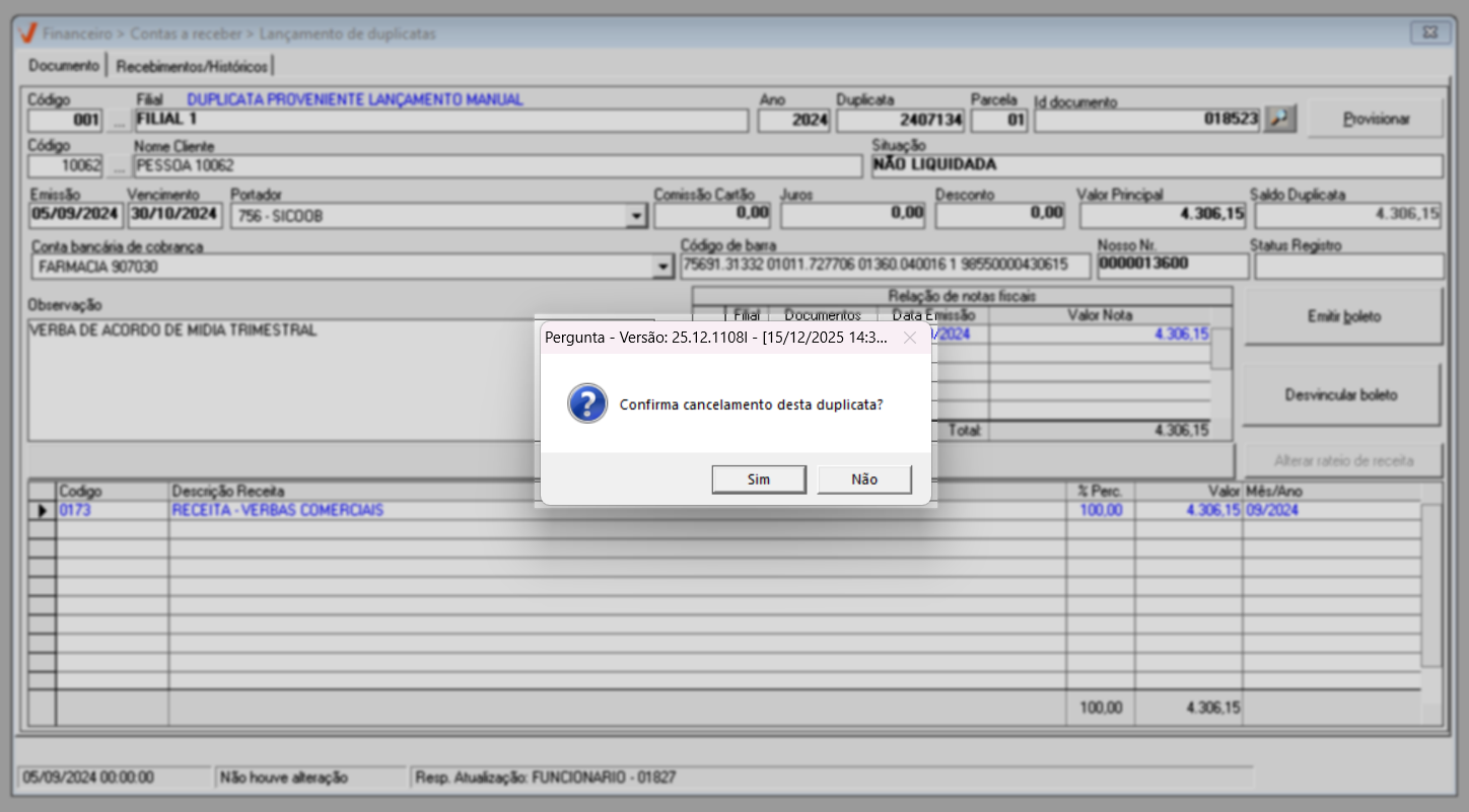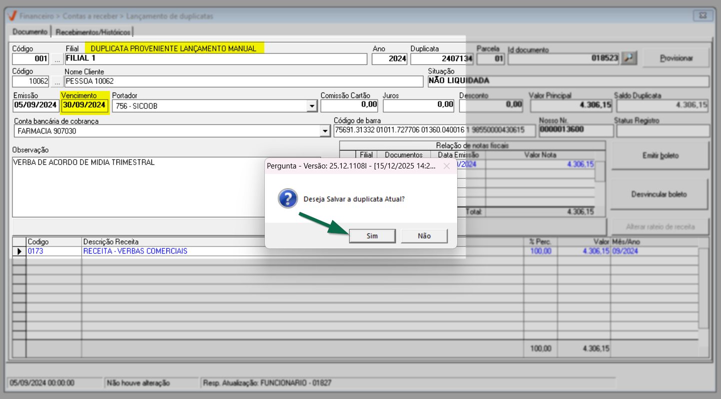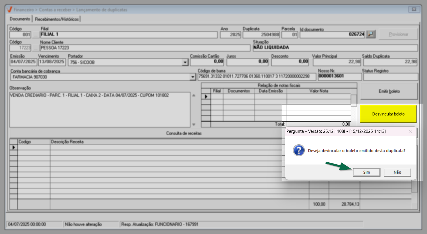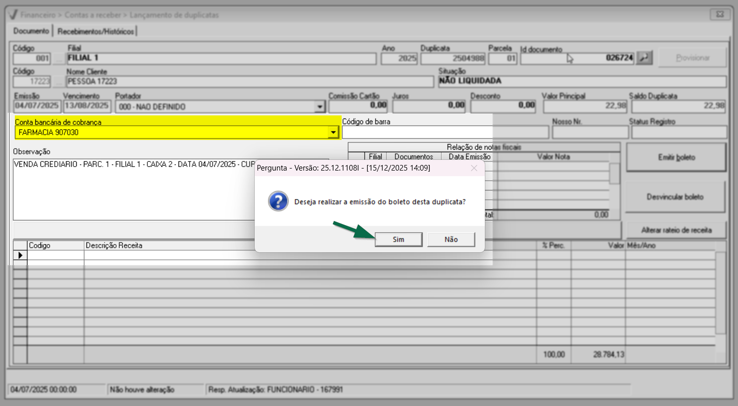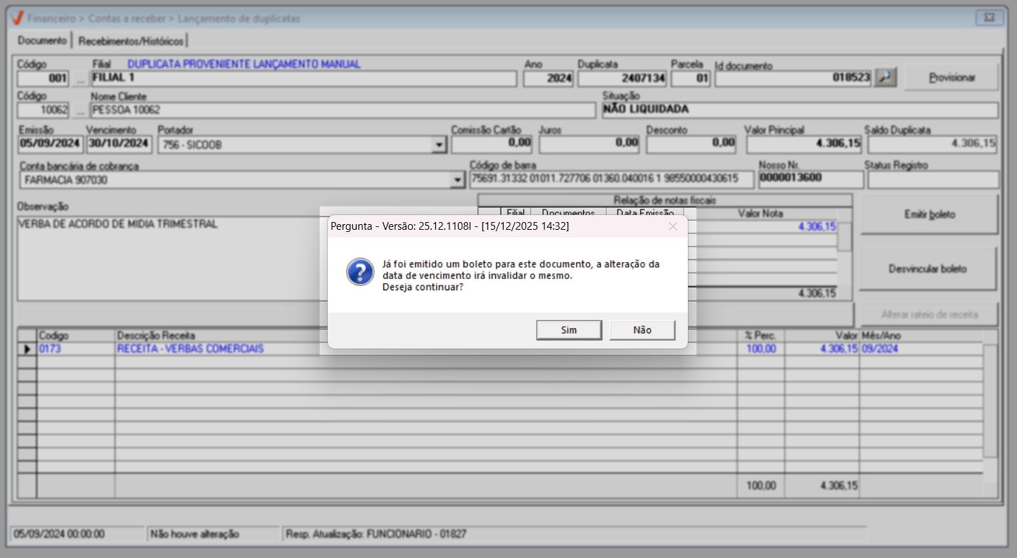 Ao confirmar, o sistema exibirá uma pergunta: "Já foi emitido um boleto para este documento. A alteração da data de vencimento invalidará o boleto anterior". Clique em >> Sim para que o sistema desconsidere as informações do boleto anterior e registre a atualização.