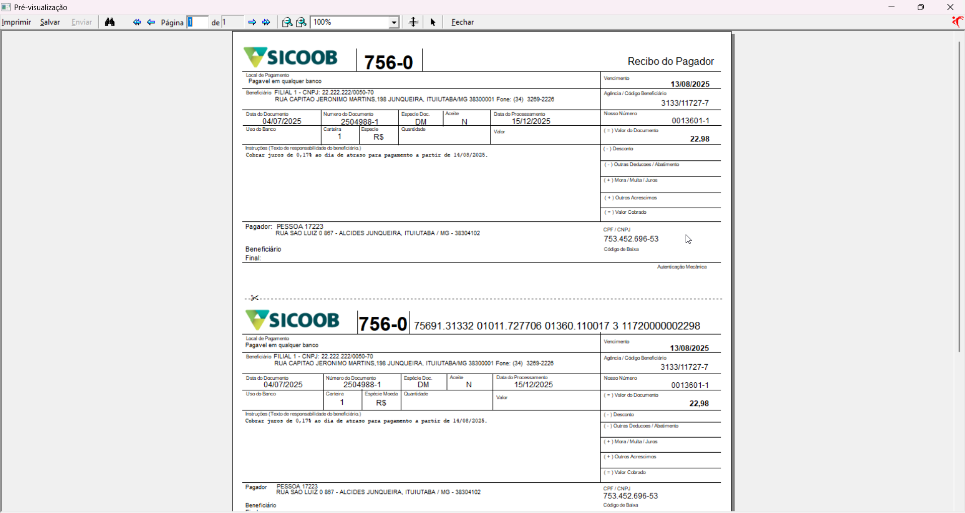 Uma vez feito isso, o boleto será apresentado em uma nova tela "Pré-visualização" para que o usuário realize a impressão.