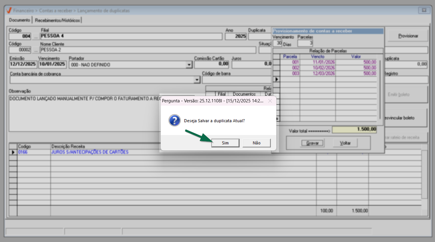 Após informar os rateios e demais detalhes corretamente, o usuário pode gravar a duplicata pressionando o atalho F2 e confirmando a operação. Além disso, o sistema oferece a opção de provisionar o documento antes da gravação, podendo assim gerar as parcelas considerando as informações informadas e selecionadas. Clique aqui para acompanhar o processo de provisionamento.