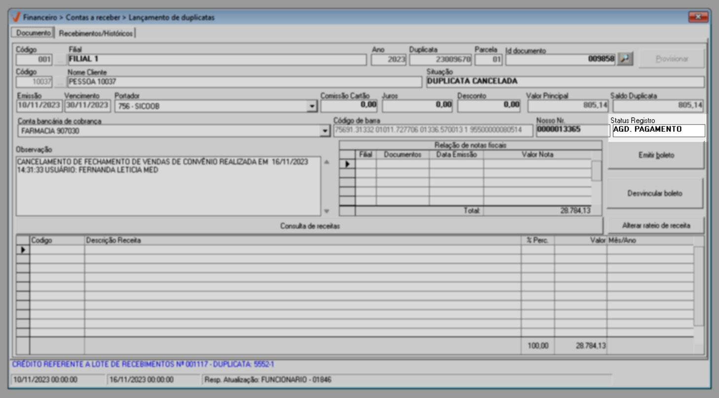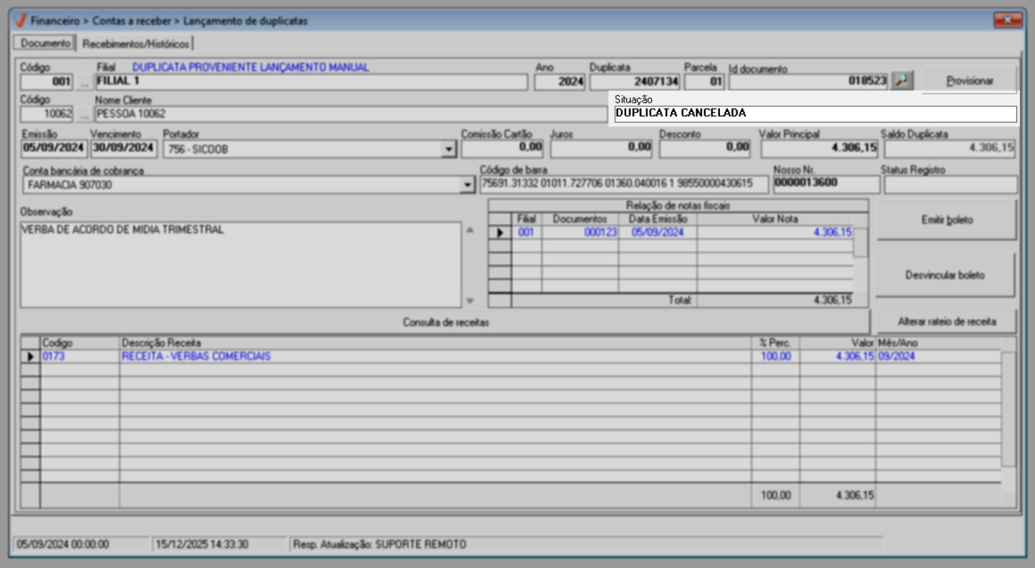 Feito isso, a duplicata terá sua situação alterada para "Duplicata Cancelada", o que impedirá qualquer movimentação financeira futura associada a ela. Veja o exemplo a seguir: