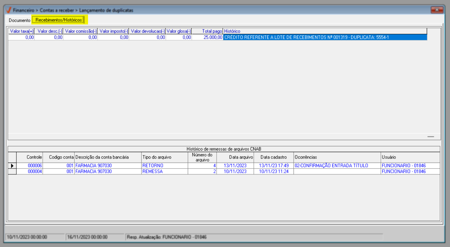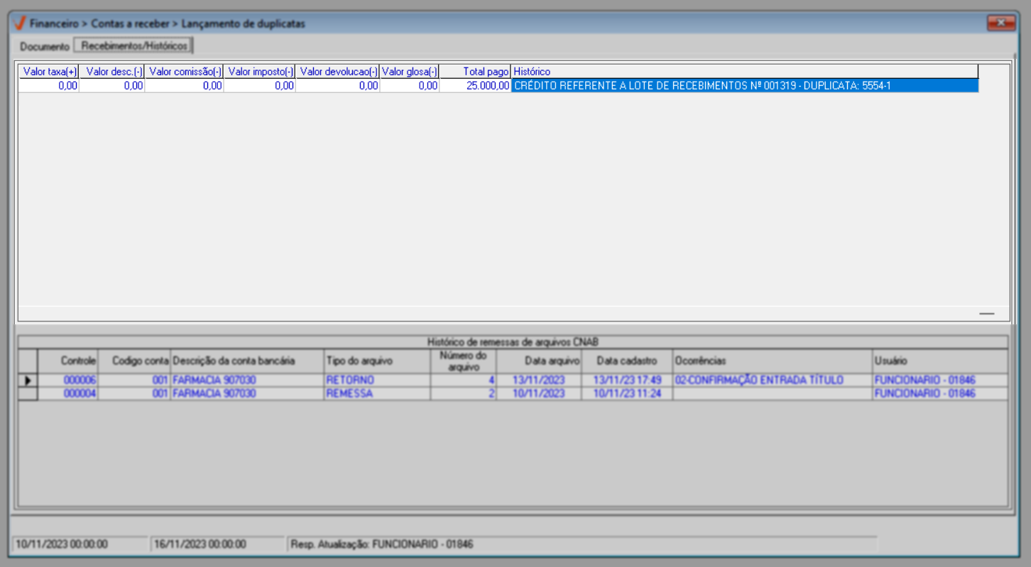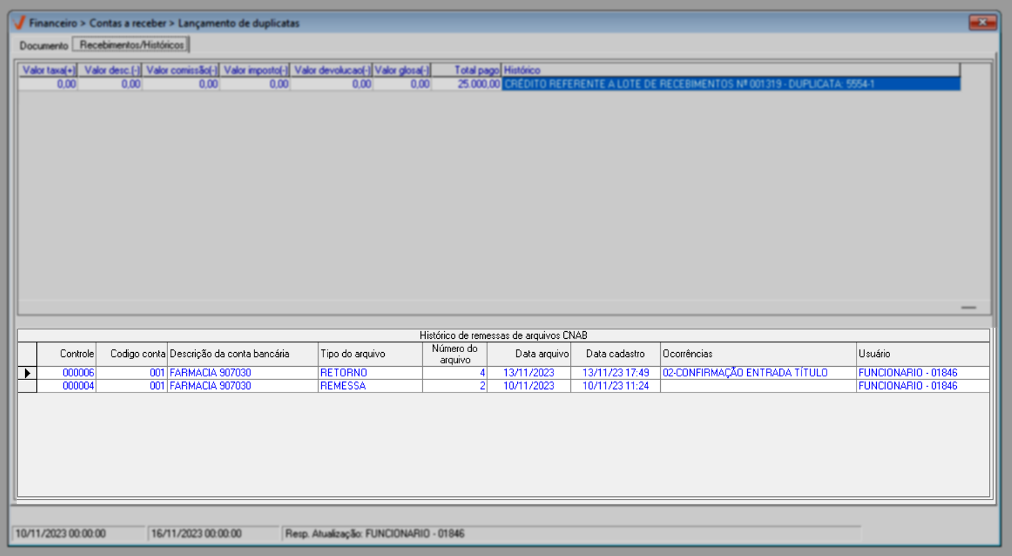 Com os dados carregados na tela, o usuário poderá acessar a aba “Recebimentos/Históricos” para analisar o histórico de pagamentos do documento. Nessa aba, é possível acompanhar tanto pagamentos parcelados quanto pagamento único, quando não houver parcelas e o título já estiver quitado, além de consultar o histórico de remessas e retornos de arquivos CNAB, caso existam registros vinculados ao documento.