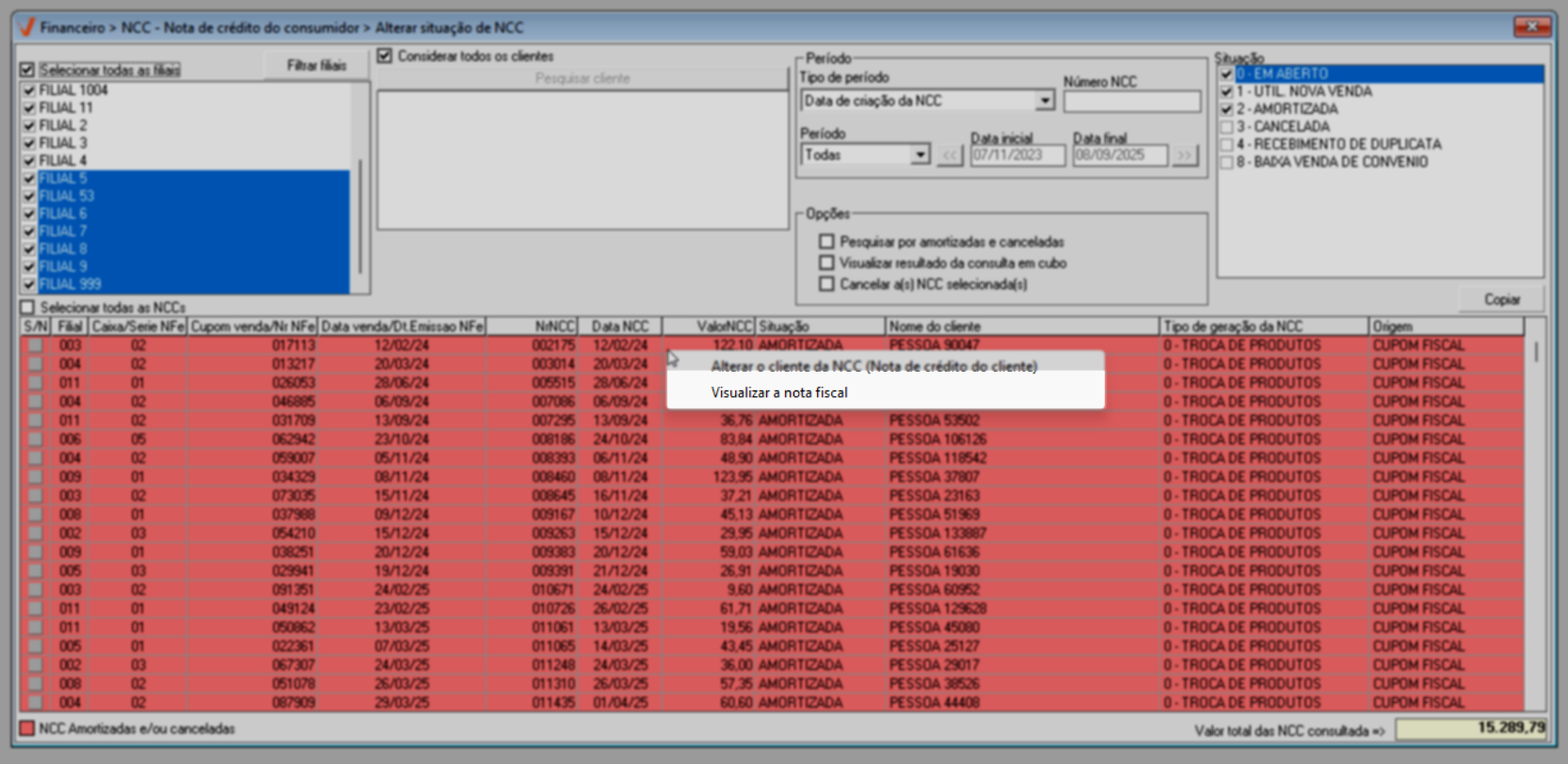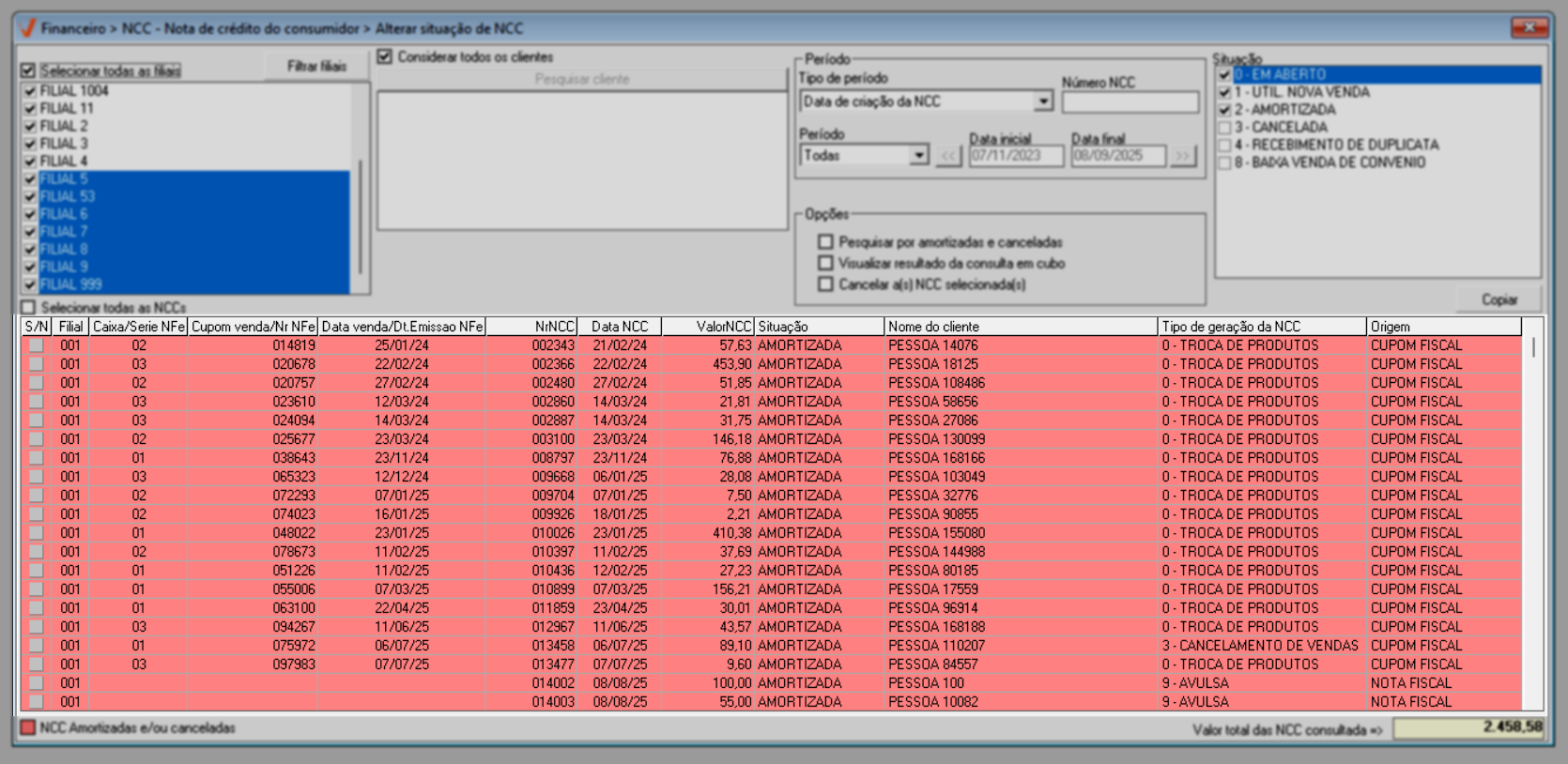 Para visualizar e tornar disponível uma NCC amortizada ou cancelada. Aplique a opção de pesquisa "Pesquisar por amortizadas e canceladas" e tecle o atalho F6. A pesquisa apresentará destacadas de vermelho, apenas as notas de crédito amortizadas (utilizadas) e canceladas (não utilizadas).