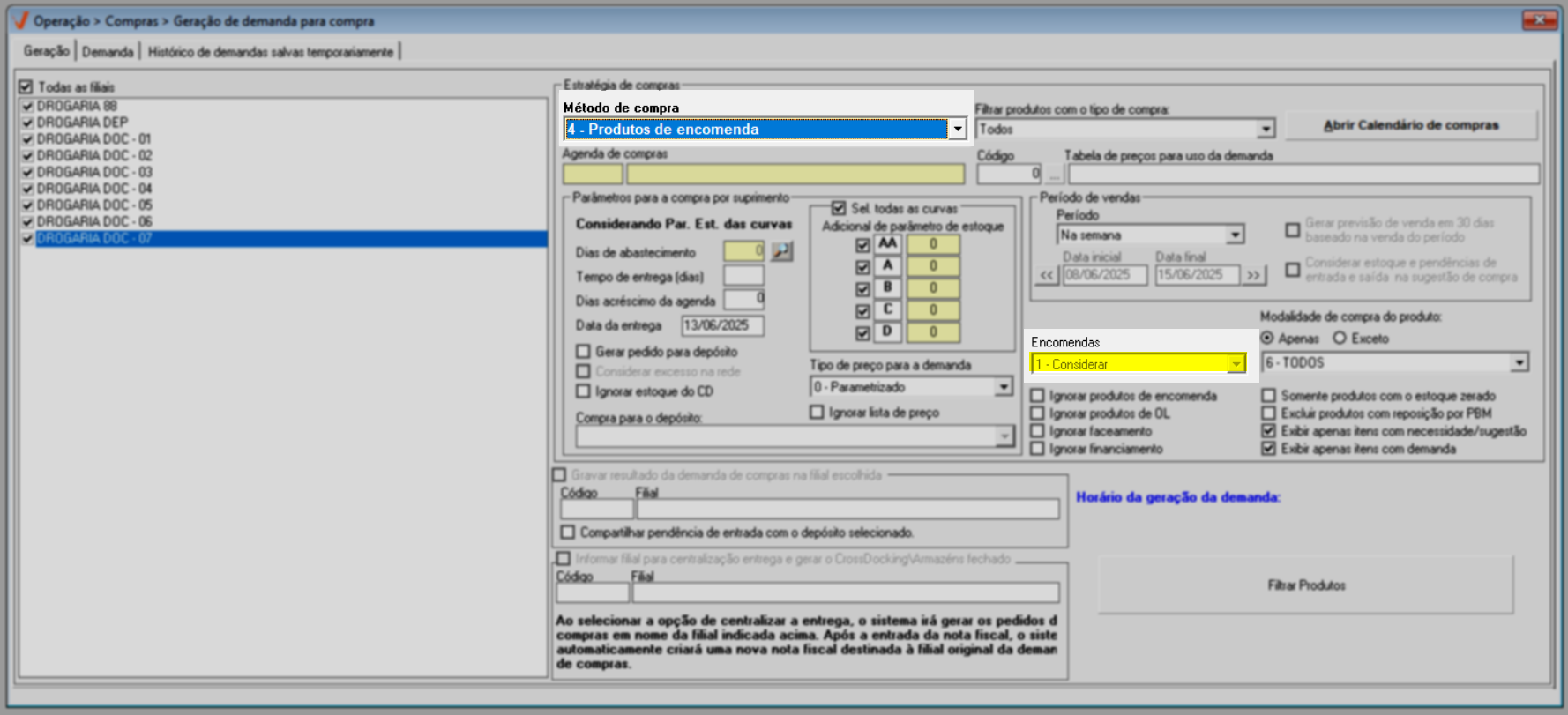 Quando utilizado a geração de demanda de compras na filial distribuidora, o usuário perderá a visão dos históricos das movimentações que favorecem toda a rede. Em vez disso, será exibido apenas o histórico do depósito selecionado. Portanto, é importante estar atento a essa abordagem de análise, pois ela se concentra especificamente nas características e necessidades do depósito escolhido, em detrimento da visão mais abrangente que consideraria toda a rede de operações.