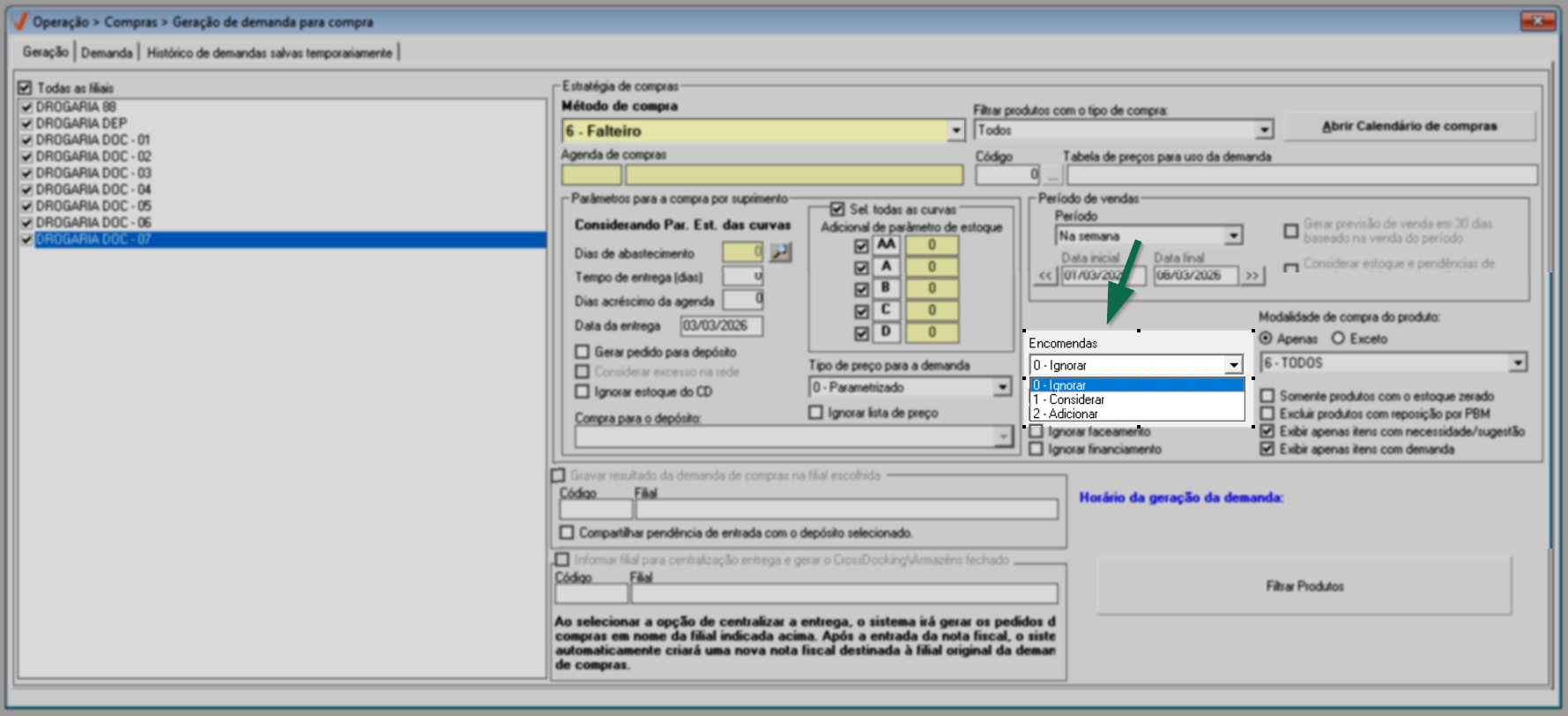 O critério de encomenda “Considerar” indica que o sistema deverá sugerir a compra do produto encomendado, abatendo essa quantidade da necessidade calculada para a loja. No método de compra “Produtos de encomenda”, essa opção é selecionada automaticamente, conforme mencionado. Já nos demais métodos de compra, o campo “Encomenda” permanece habilitado e, por padrão, o sistema sugere a opção “Ignorar”, desconsiderando os produtos de encomenda na análise para geração da demanda. Nesses casos, o usuário poderá manter a opção “Ignorar”, caso não deseje incluir as encomendas na análise; selecionar a opção “Considerar”, para abater a quantidade encomendada da necessidade calculada ou escolher “Adicionar”, opção que sugere a compra do produto encomendado somando essa quantidade à necessidade calculada para a loja, sem realizar abatimento.