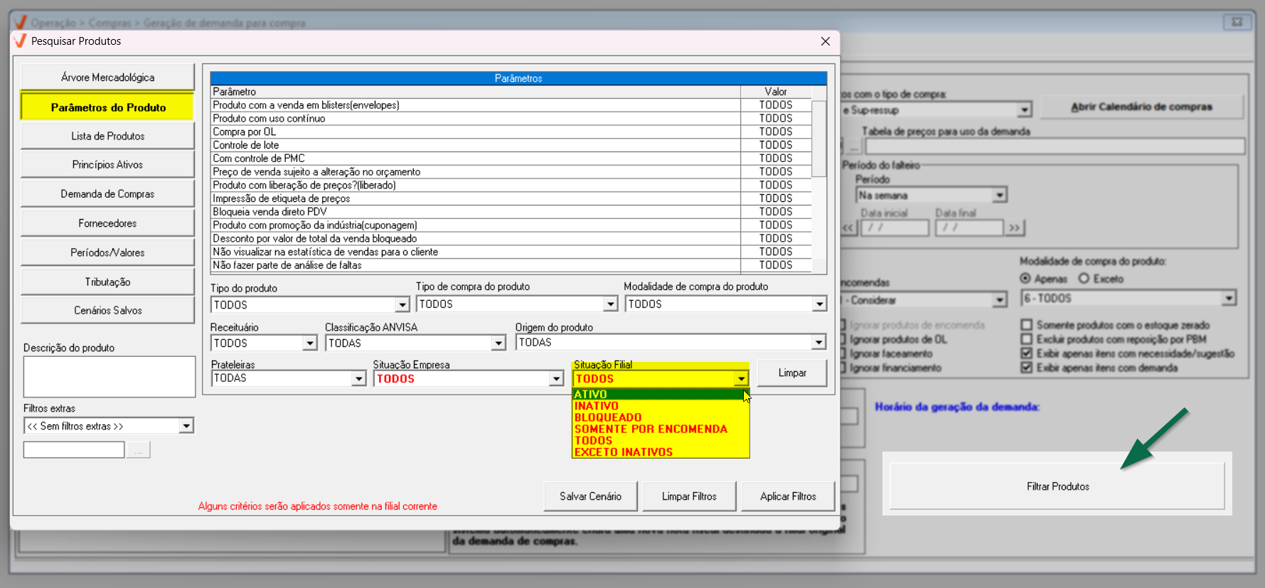 Ao incluir encomendas em uma demanda de compra, o sistema considerará todos os produtos vinculados à encomenda, independentemente do seu status. Os itens podem estar com situação "Ativo", "Inativo", "Bloqueado" ou ainda com o status específico “Somente por encomenda”. Como se trata de uma solicitação formal do cliente, entende-se que há necessidade de aquisição do produto, motivo pelo qual todos os status são considerados no momento da geração da demanda. Entretanto, caso a loja adote a política de comprar apenas produtos com determinada situação,  por exemplo, somente "Ativo" ou "Somente por encomenda", recomenda-se utilizar o botão >> “Filtrar Produtos”. Em seguida, acessar a guia “Parâmetros do Produto” e alterar o campo “Situação Filial” de “Todos” para “Ativo” (ou para a situação desejada). Dessa forma, o usuário poderá definir quais produtos deverão ser considerados na análise da demanda de compra, conforme as regras internas da loja.