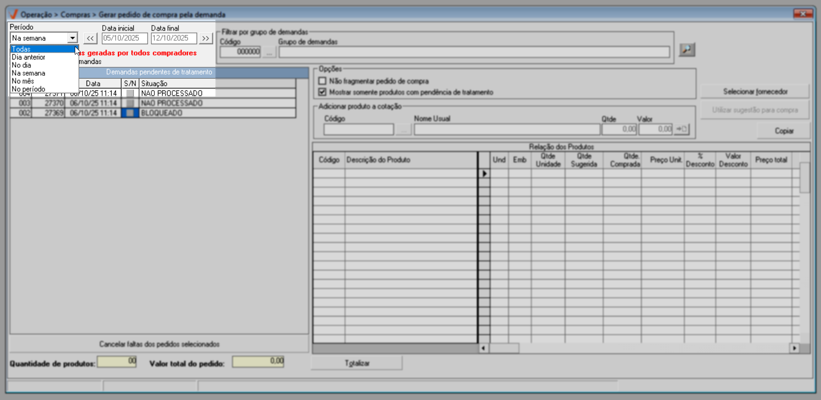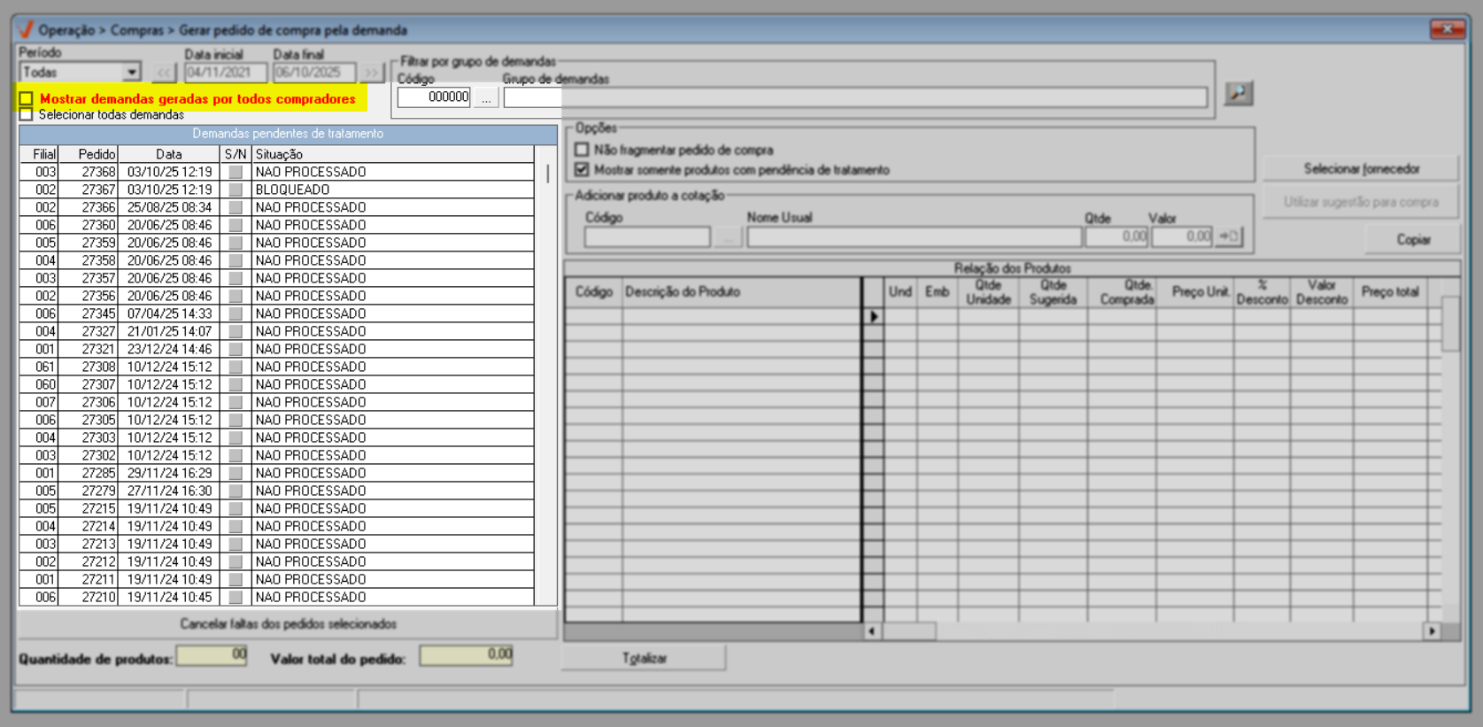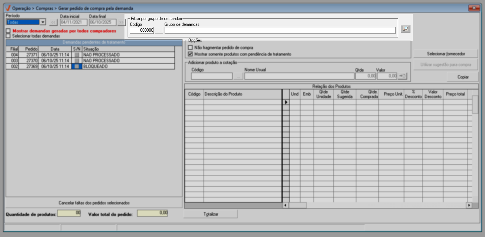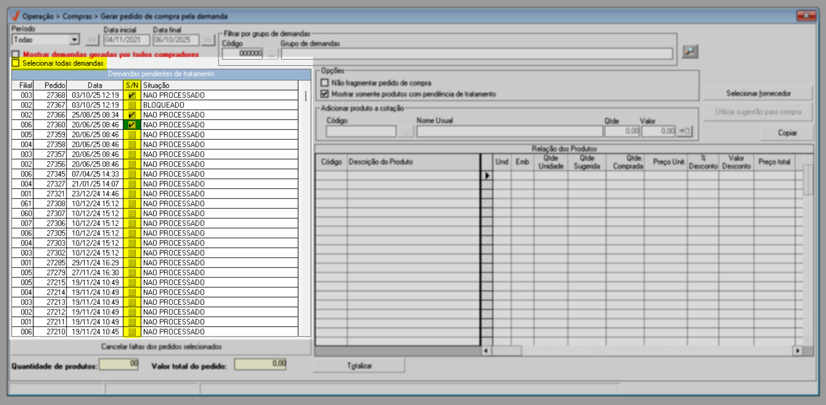 Após identificar as demandas de compra e ajustar as opções conforme sua necessidade, pressione o atalho F6 e aguarde o sistema localizar os produtos que compõe as demandas selecionadas. O andamento pode ser acompanhado na barra azul localizada no rodapé da tela; quando a barra estiver completamente preenchida, o processo de busca dos produtos estará finalizado.