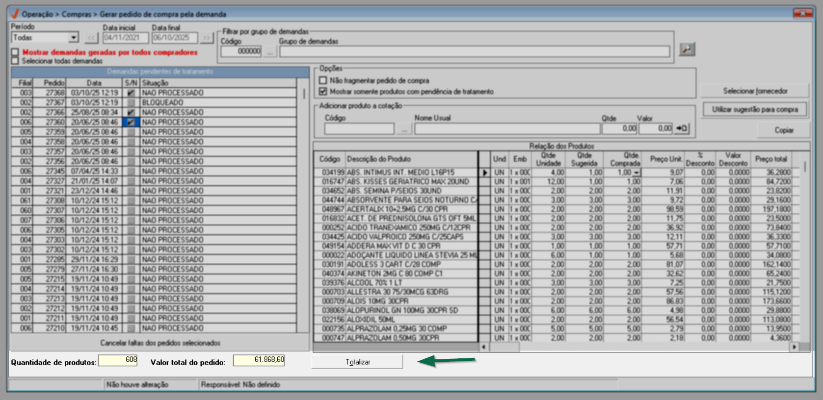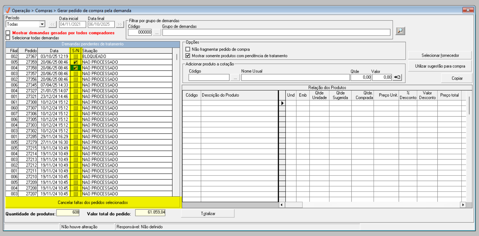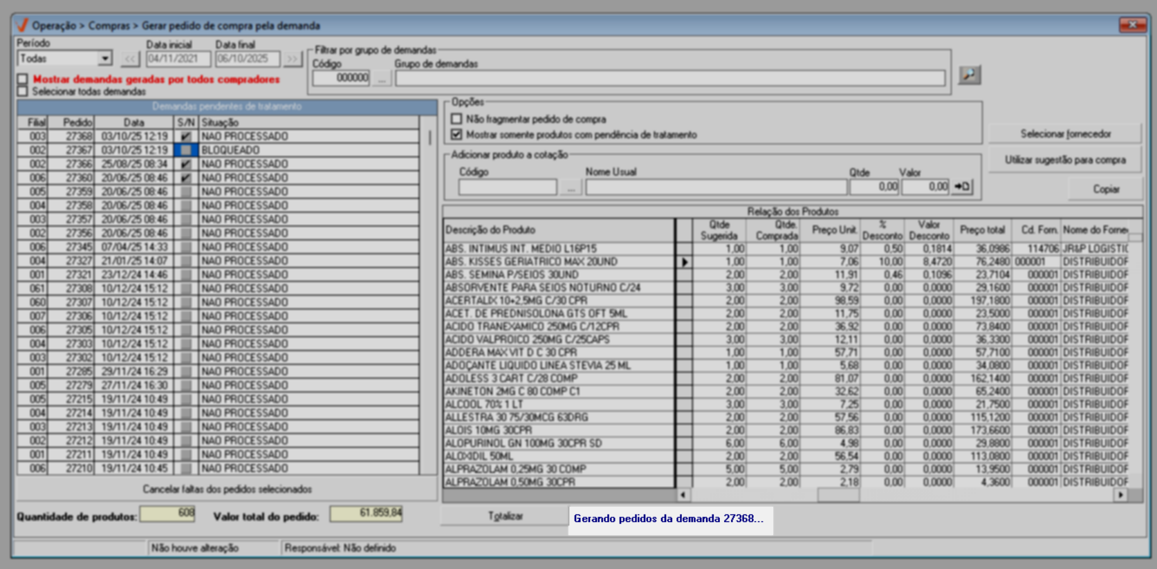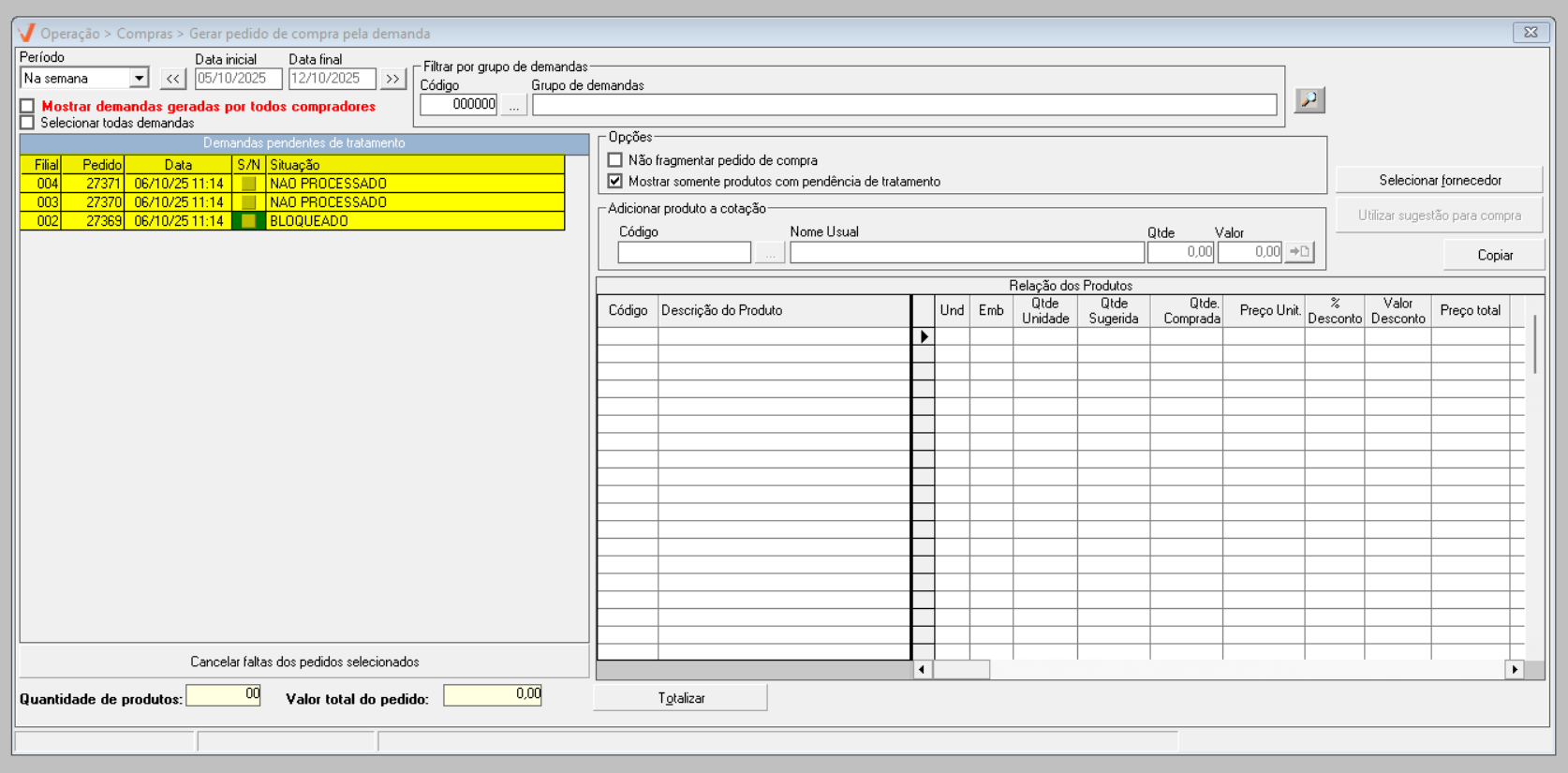 Após identificar as demandas de compra e ajustar as opções conforme sua necessidade, pressione o atalho F6 e aguarde o sistema localizar os produtos que compõe as demandas selecionadas. O andamento pode ser acompanhado na barra azul localizada no rodapé da tela; quando a barra estiver completamente preenchida, o processo de busca dos produtos estará finalizado.