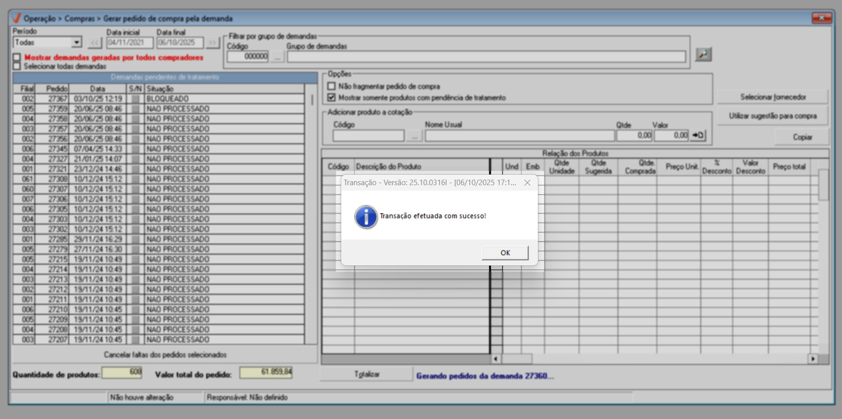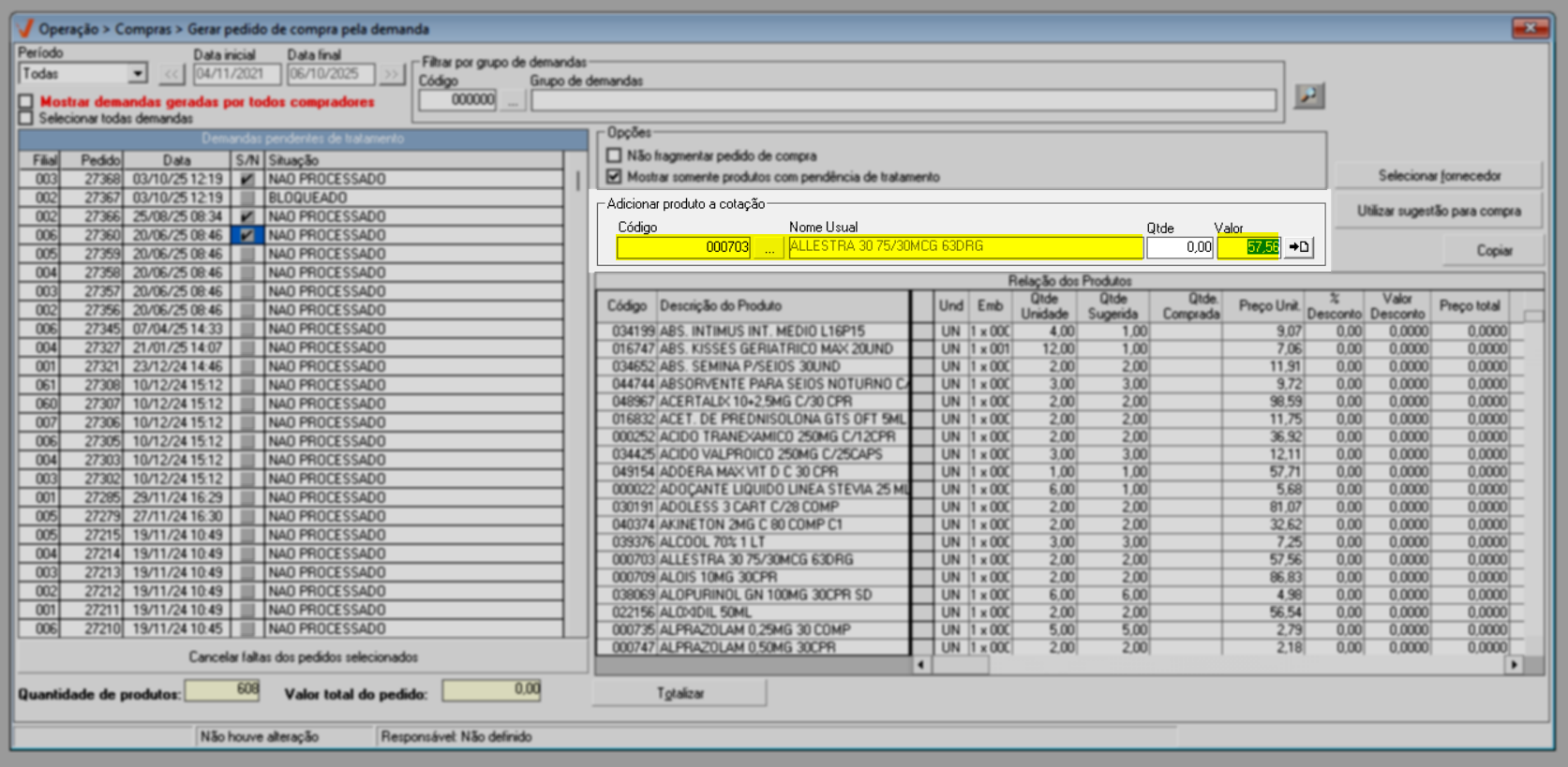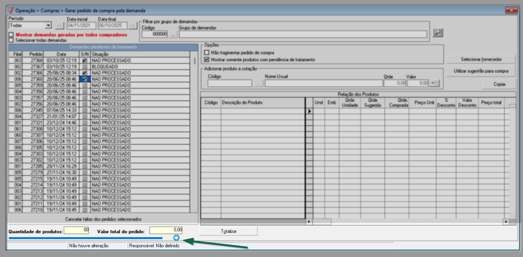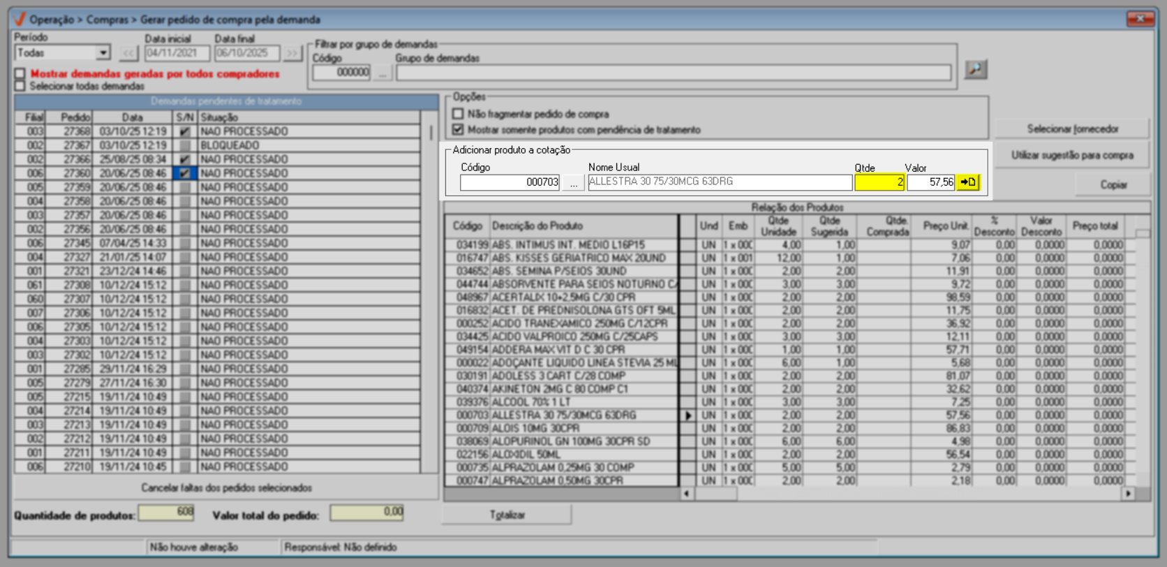Após identificar as demandas de compra e ajustar as opções conforme sua necessidade, pressione o atalho F6 e aguarde o sistema localizar os produtos que compõe as demandas selecionadas. O andamento pode ser acompanhado na barra azul localizada no rodapé da tela; quando a barra estiver completamente preenchida, o processo de busca dos produtos estará finalizado.
