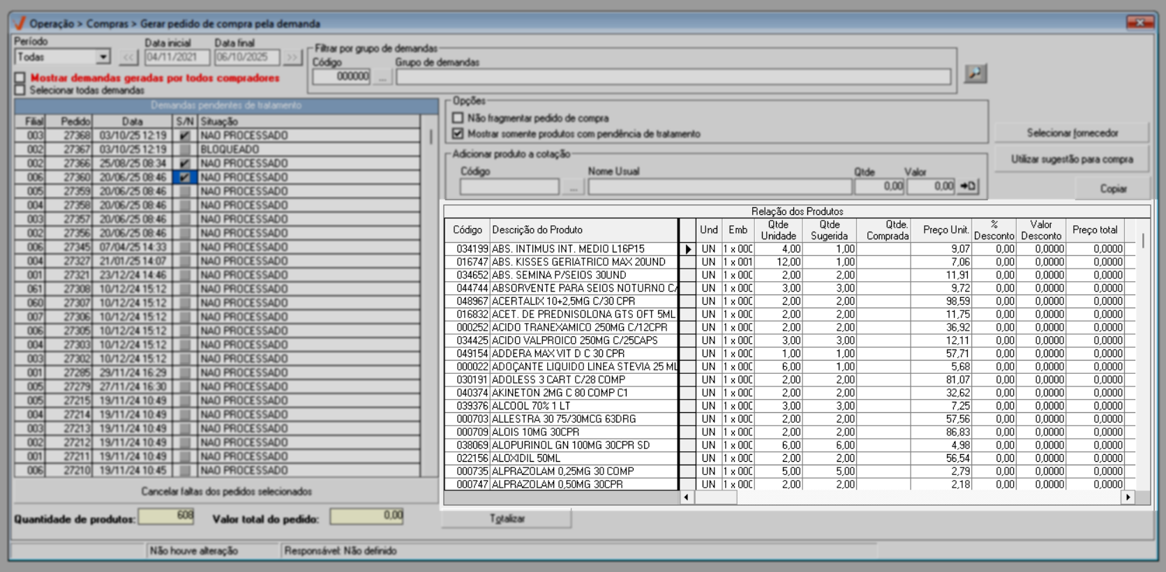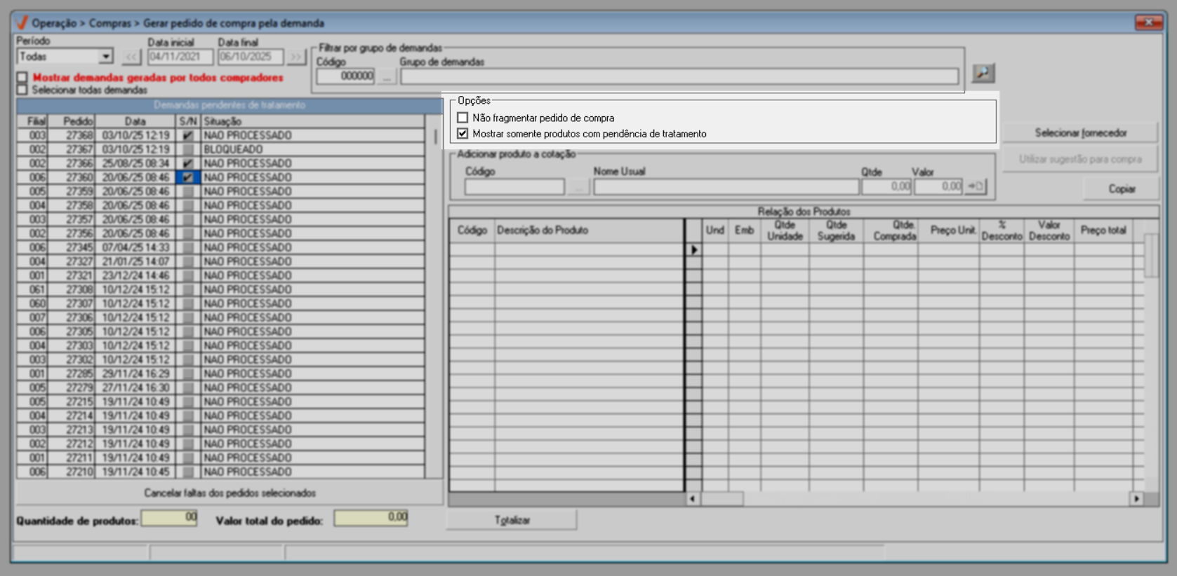 - Mostrar apenas os produtos com pendência de tratamento: Essa opção é sugerida pelo sistema e caso mantenha sua marcação, a lista exibirá somente os produtos que ainda não possuem nenhum pedido de compra gerado, facilitando a identificação dos itens que requerem ação.