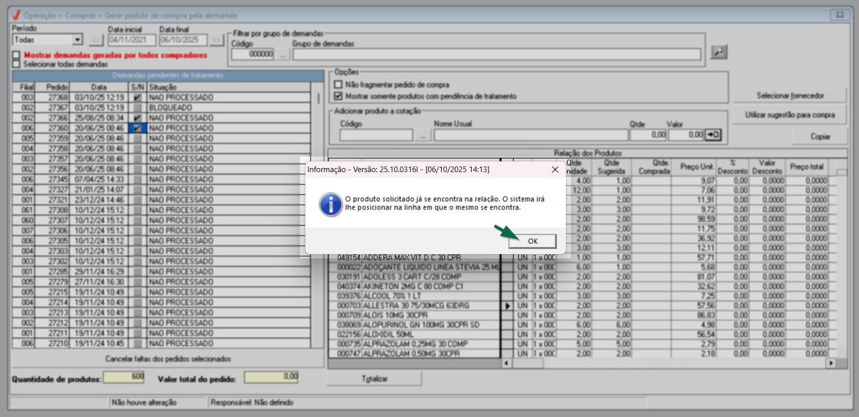 Se o produto informado já estiver na lista de cotação, o sistema exibirá uma mensagem de alerta informando que o item já está presente. Clique em >> Ok para confirmar a leitura da mensagem.