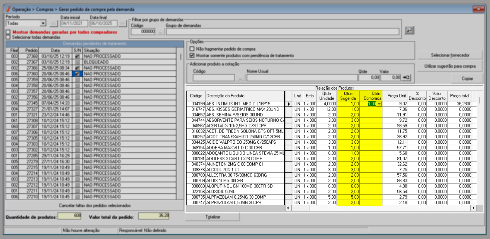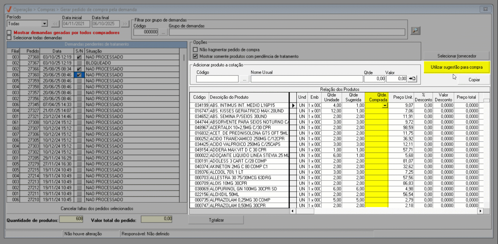 - Qtde. Sugerida: Quantidade de unidades do produto recomendada na demanda de compra.